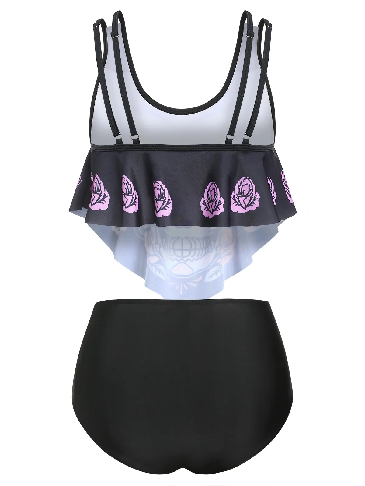 Skull Flower Print Flounce Padded Swimsuit Women Two Piece Set Floral Print Brief Gothic Swimwear for Beach Party Summer
