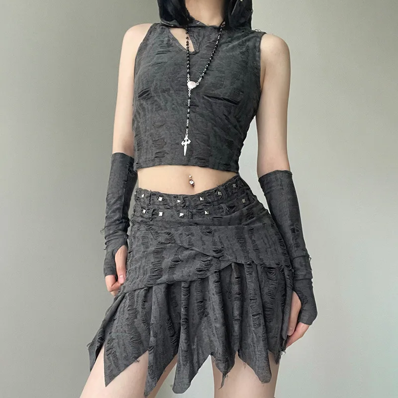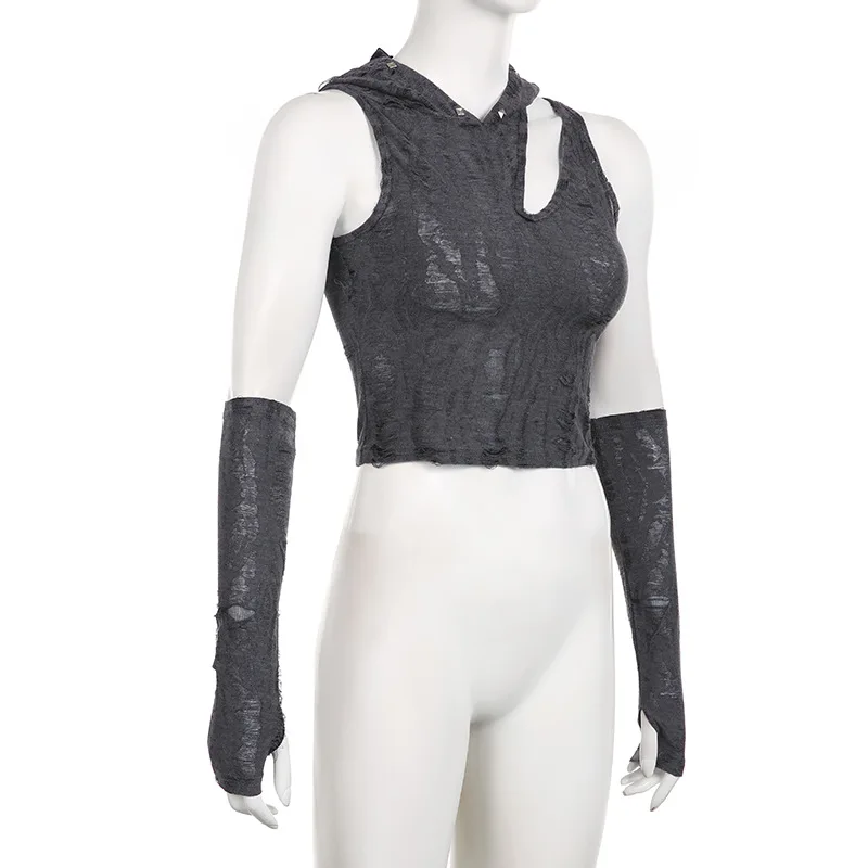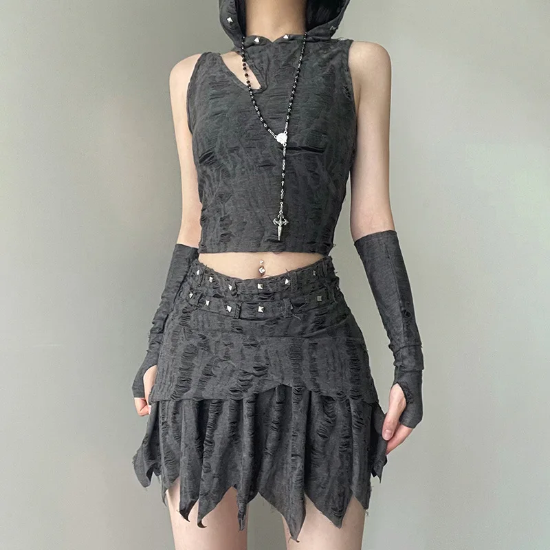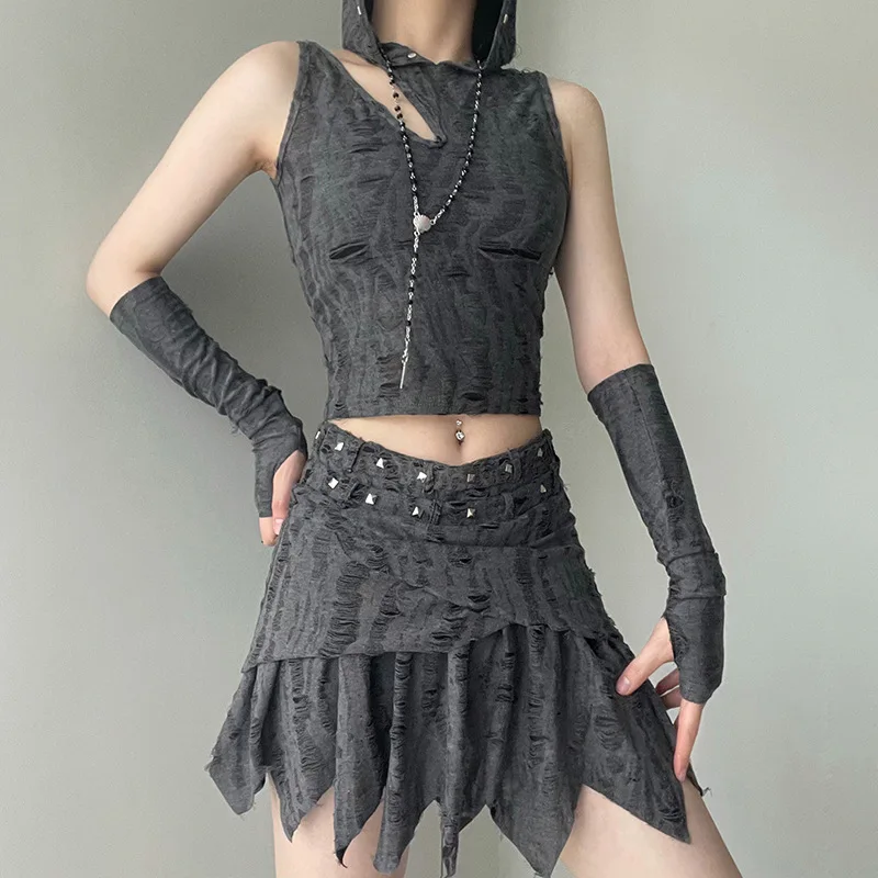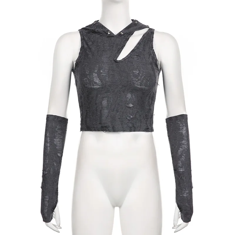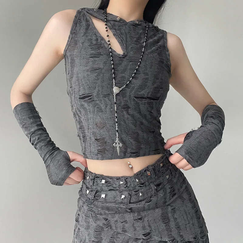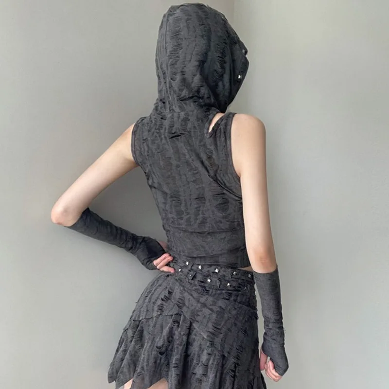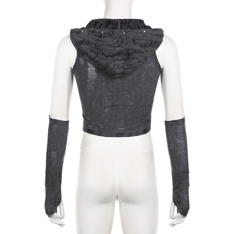 Frayed Cut Out Cyber Y2k Tank Tops Gothic Punk Rivet Hooded Sexy Female Crop Top Grunge Bodycon Streetwear With Gloves