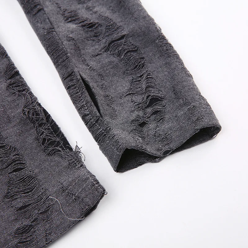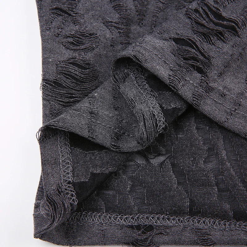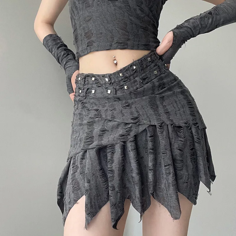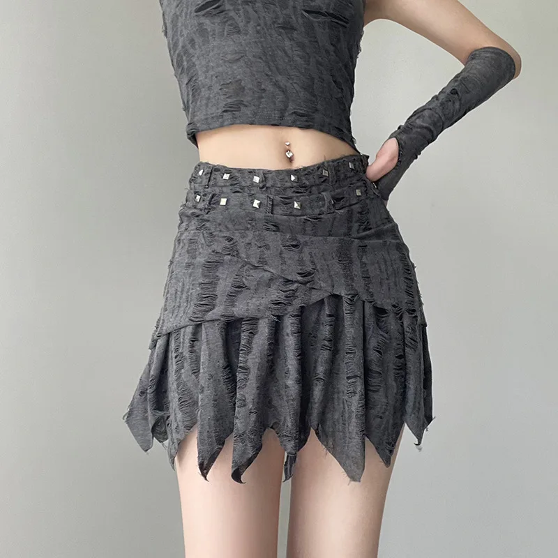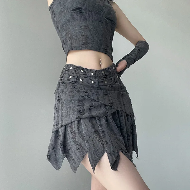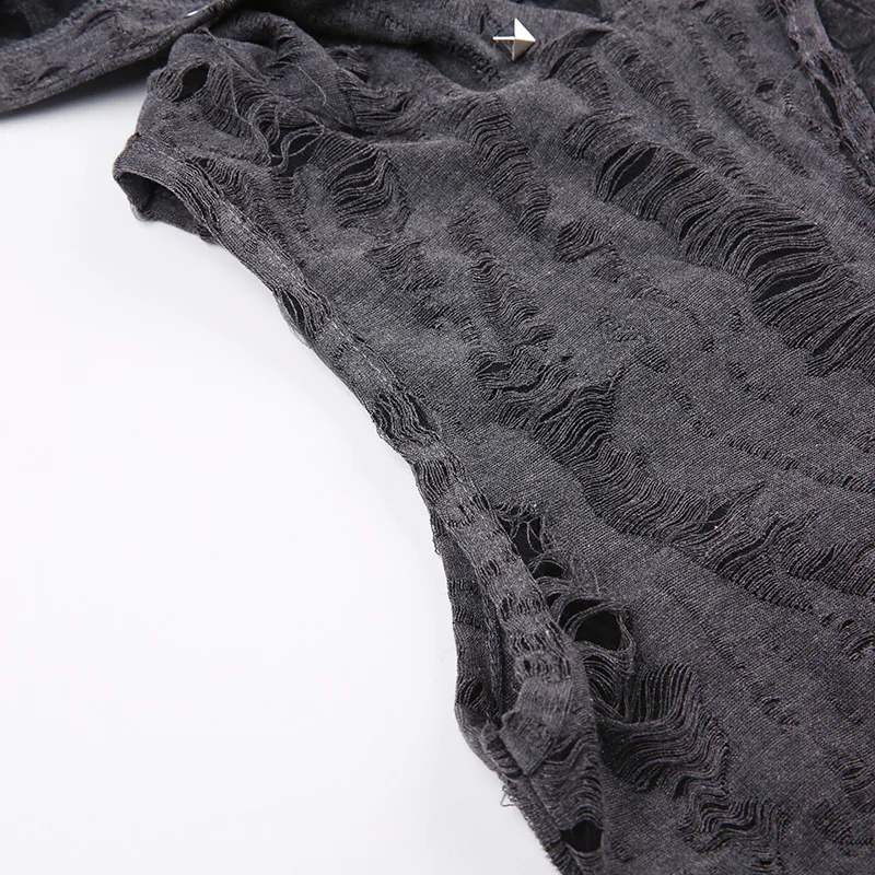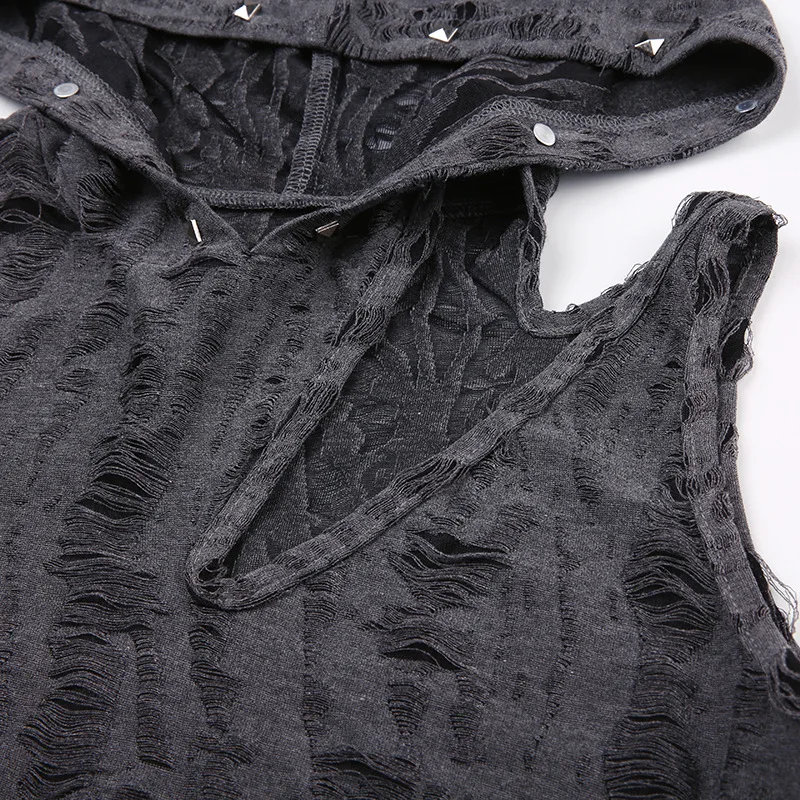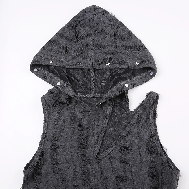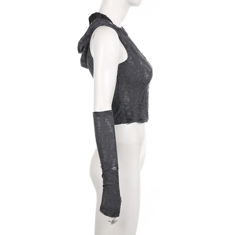 Frayed Cut Out Cyber Y2k Tank Tops Gothic Punk Rivet Hooded Sexy Female Crop Top Grunge Bodycon Streetwear With Gloves