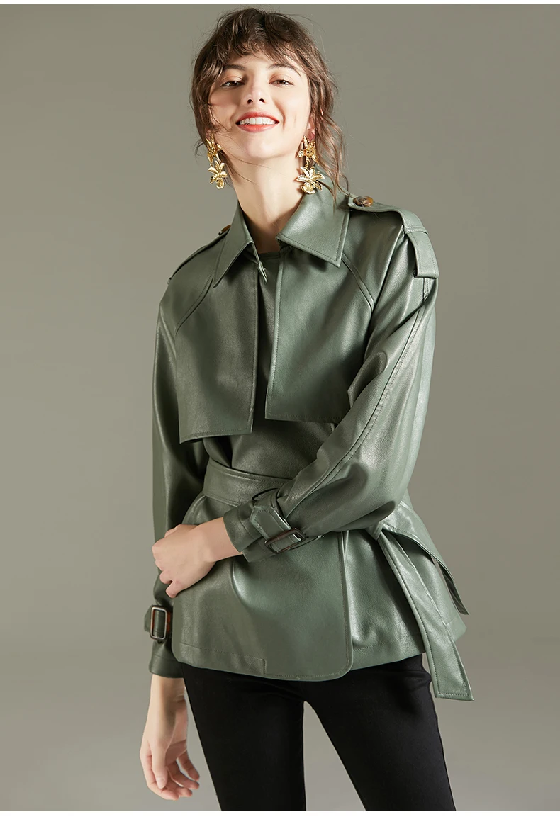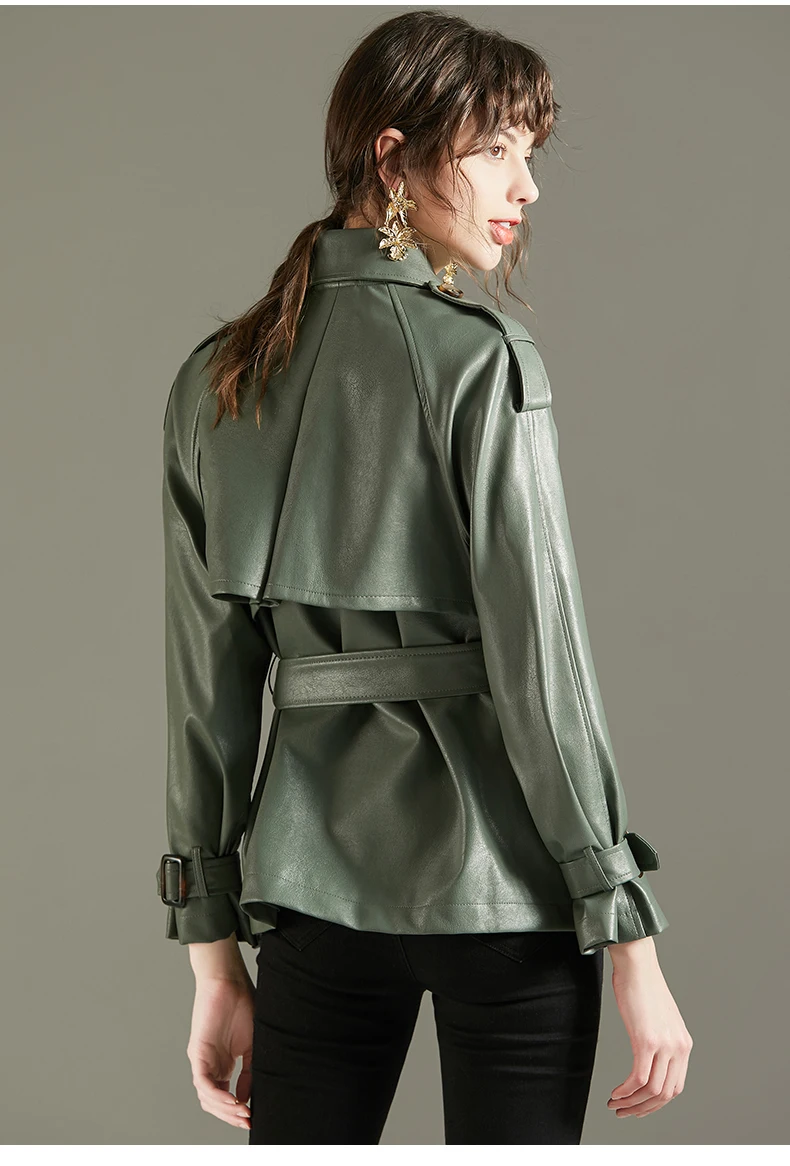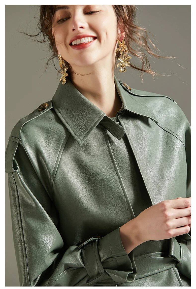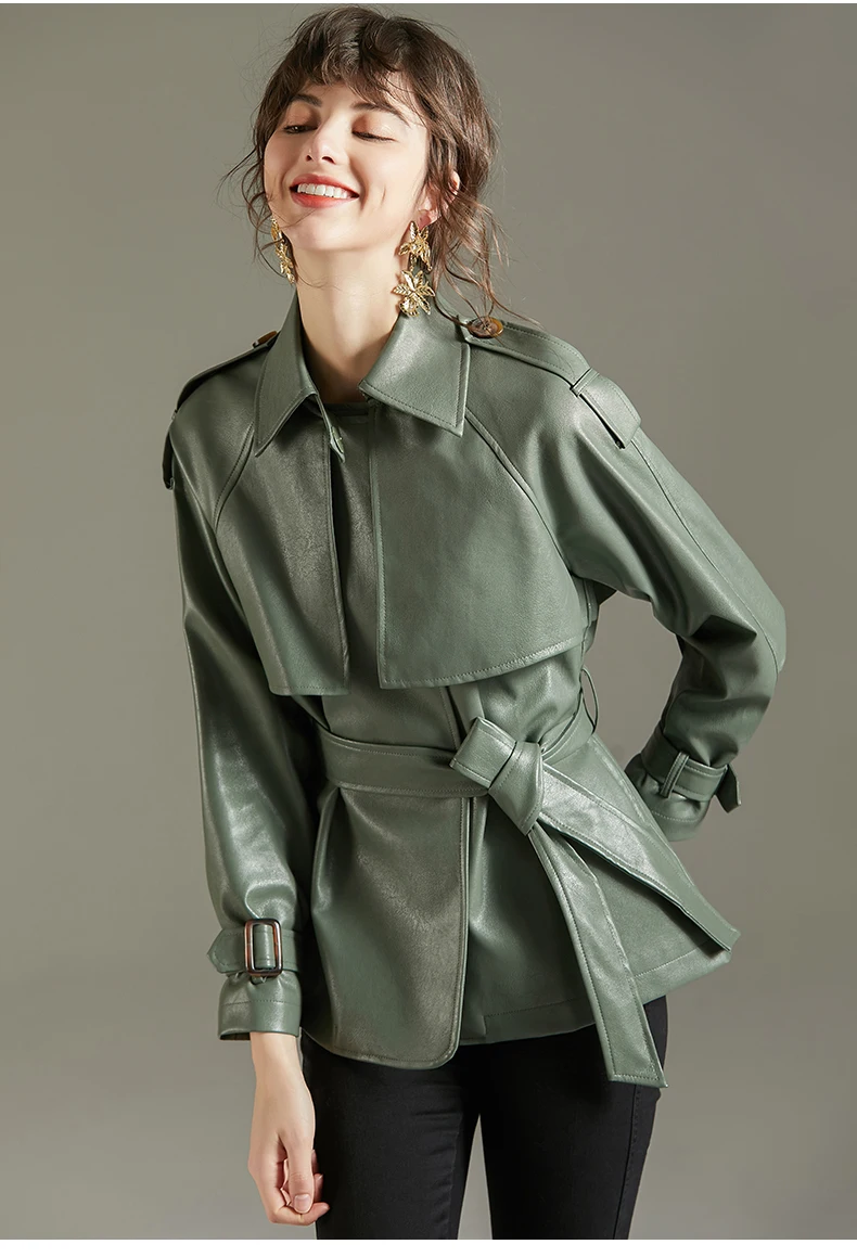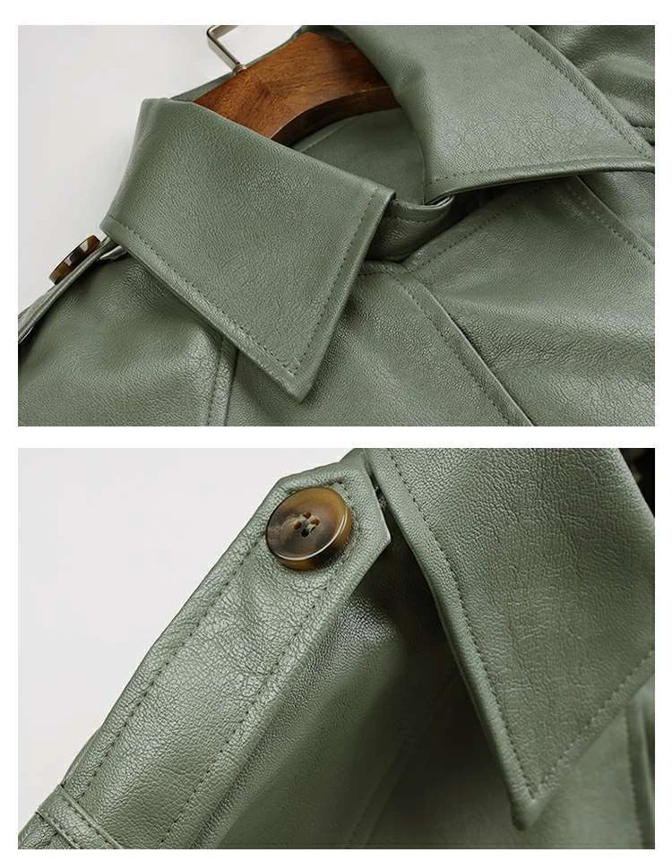 deanwangkt Spring Autumn Lapel Faux Leather Jacket Women Green PU Coat Simplicity Loose Jackets Office Lady Outwear With Belt