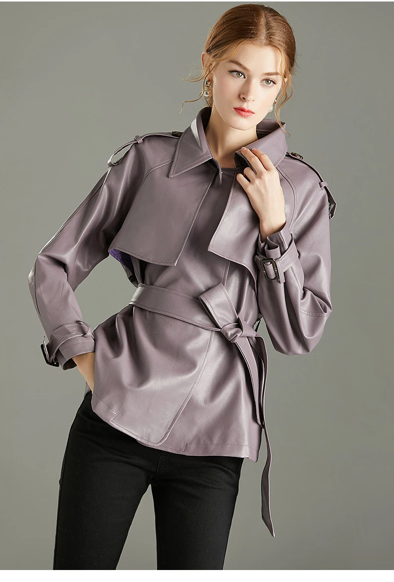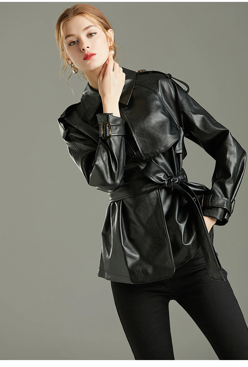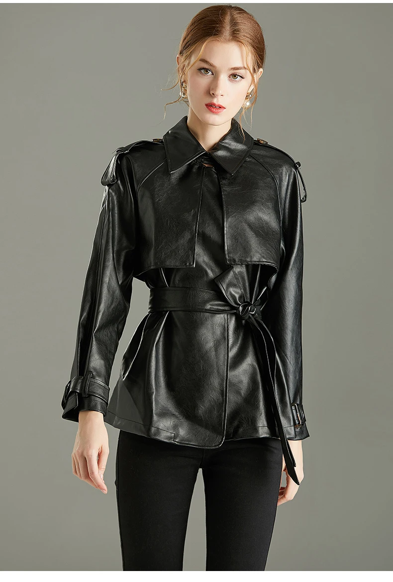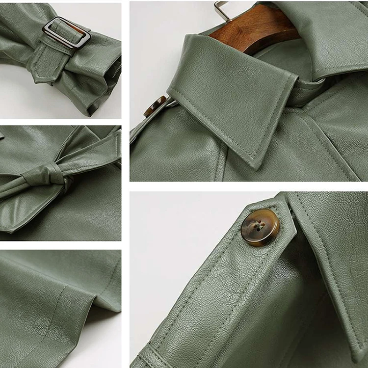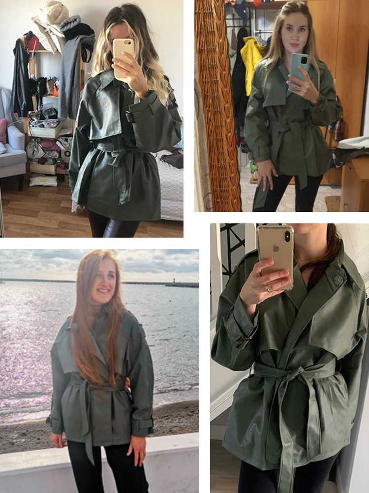 deanwangkt Spring Autumn Lapel Faux Leather Jacket Women Green PU Coat Simplicity Loose Jackets Office Lady Outwear With Belt