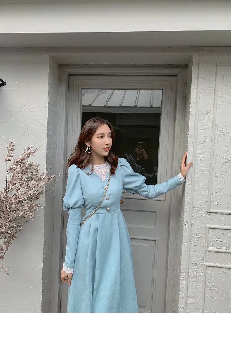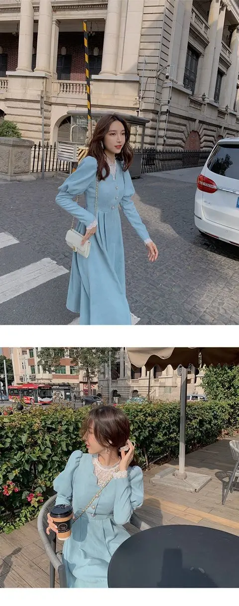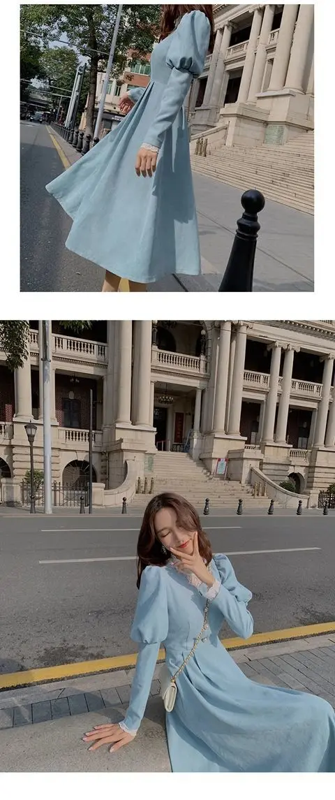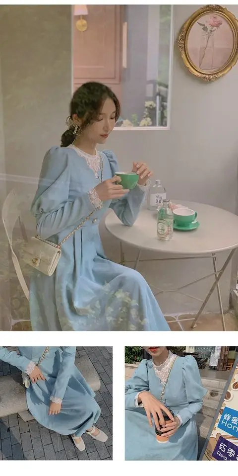 Joskka Spring Fall French Patchwork Dress Women Elegant Blue Lace Dress Female Puff Sleeve Kawaii Korean One-piece Dress