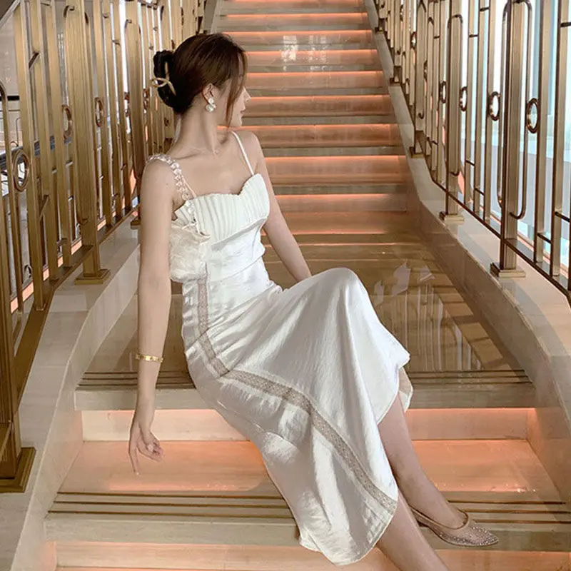 • Joskka Summer Strap Dress Women Elegant Casual White Fairy Slim Patchwork Backless Dress Female Holiday Party Midi Dress  New - Deanwangkt