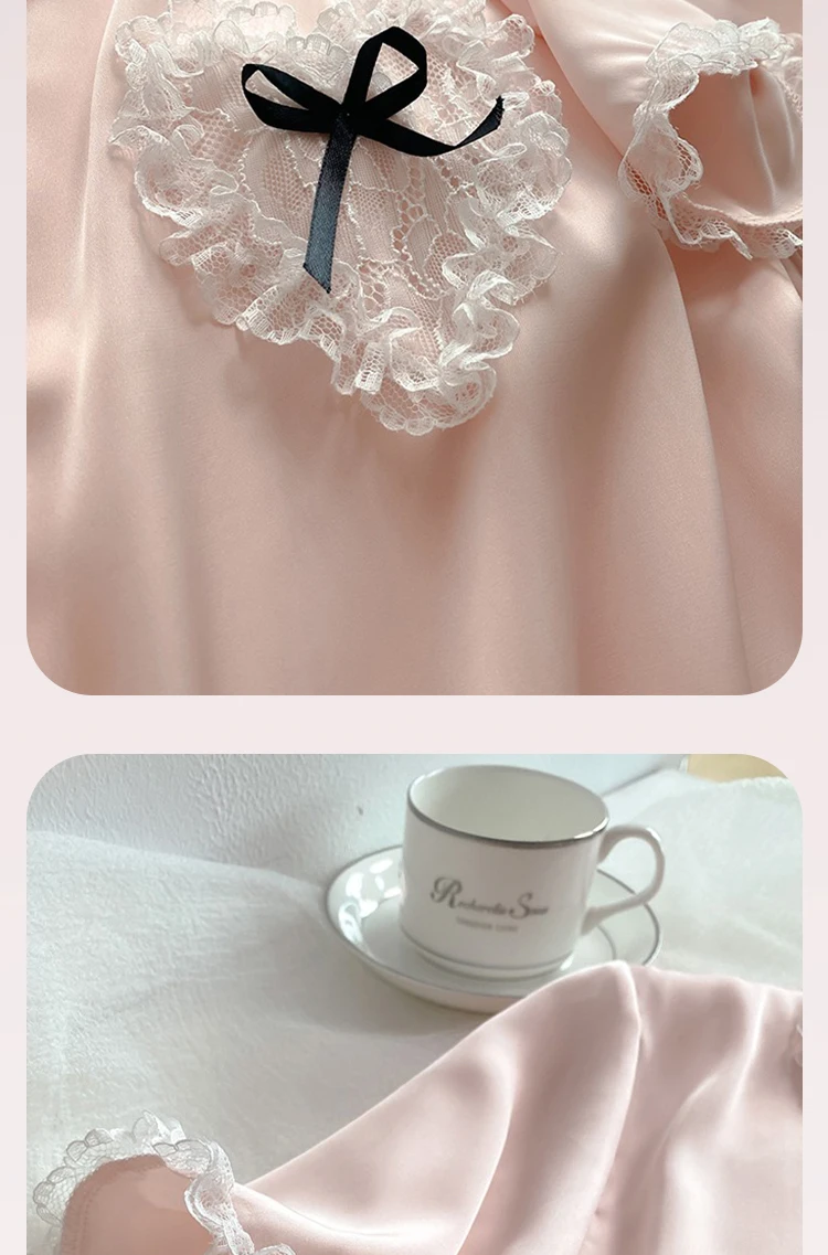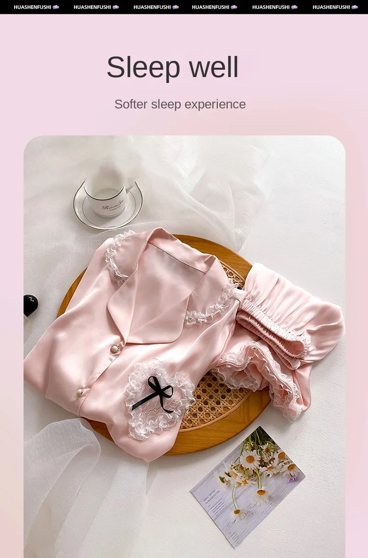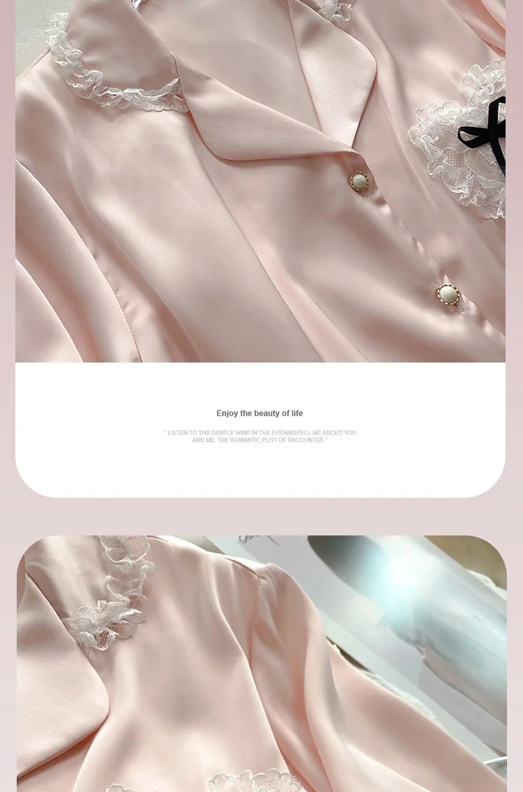 New 2 Piece Women Set Summer Short Sleeve Pajamas for Woman Fashion Silk Sleepwear Pink Lace Pocket Sexy Satin Pajama Homewear