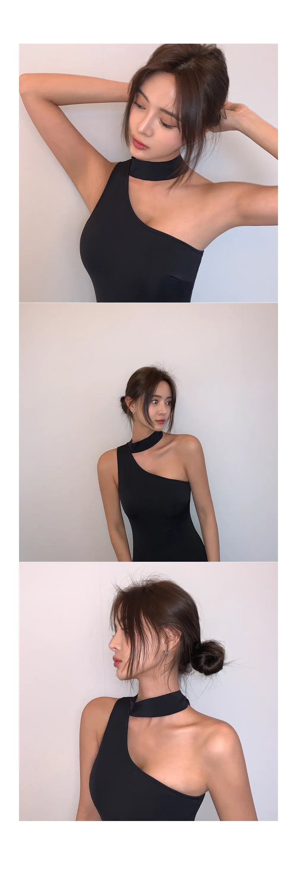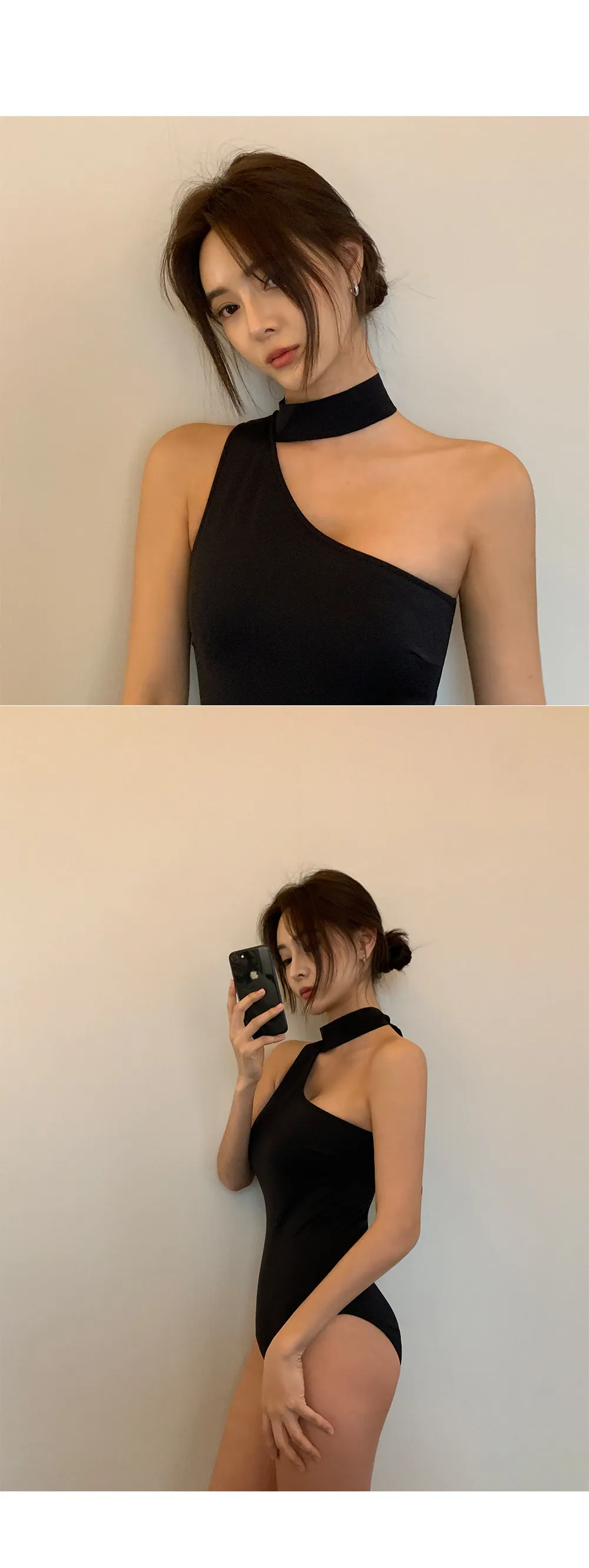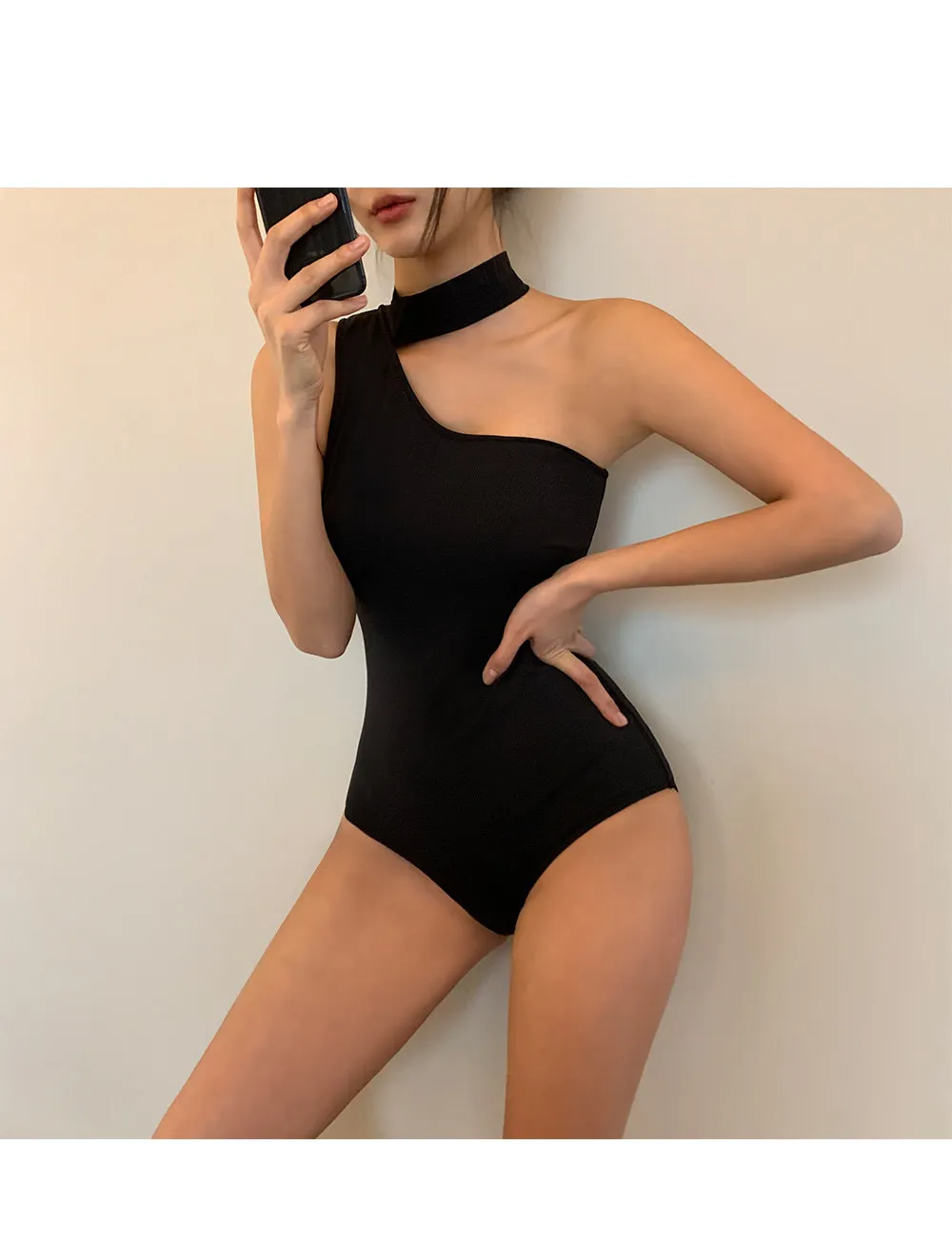 deanwangkt Sexy One Shoulder One Piece Swimsuit Women Solid Swimwear High Neck Belt Monokini Halter Swim Suit Korea Bathing Suit Push Up