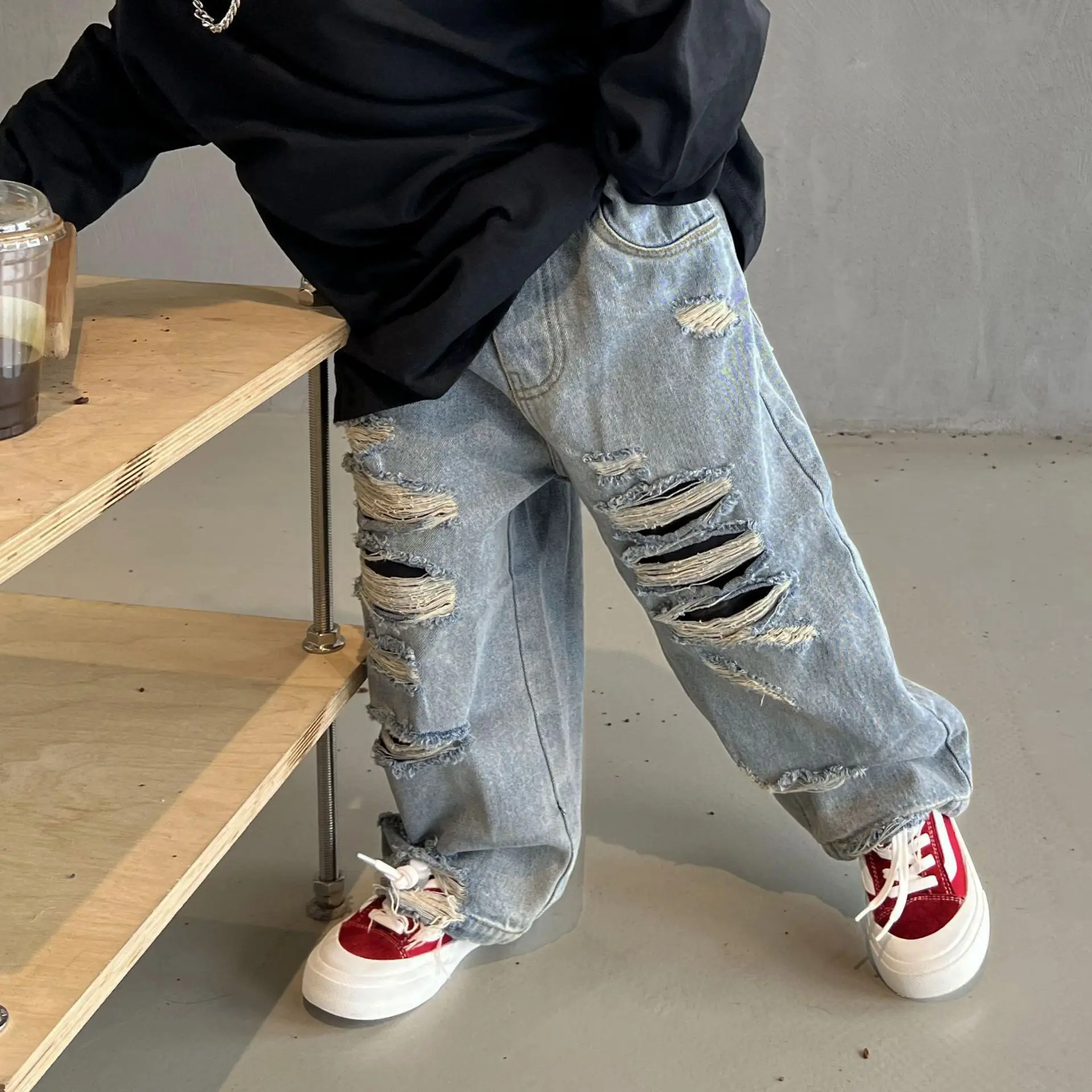 deanwangkt Spring Kids Trousers Boys Fashion Ripped Jeans Baby Girls Loose Casual Denim Pant