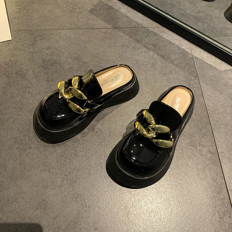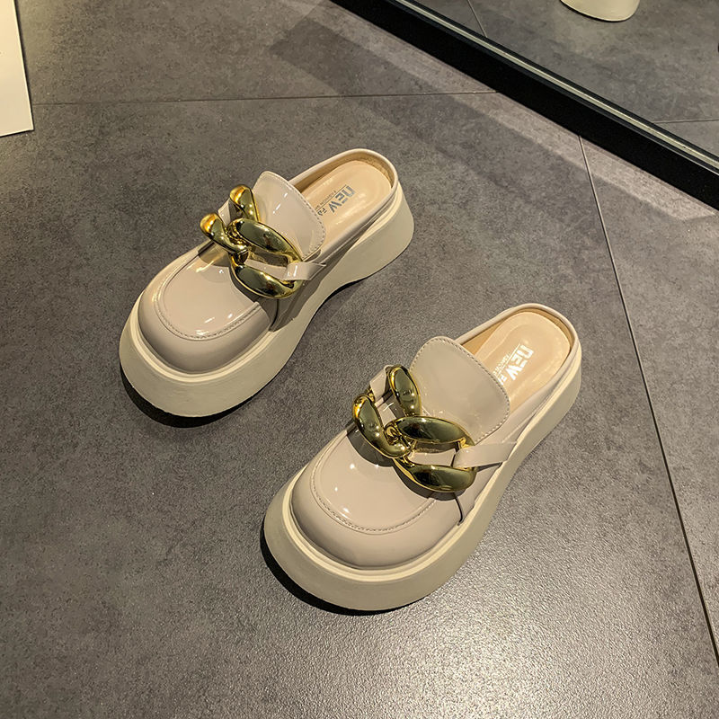 Deanwangkt New Slippers Loafer Chunky Golden Chains Women Chain Backless Leather Loafer Cork Midsole Ladies Luxury Mule Sandal