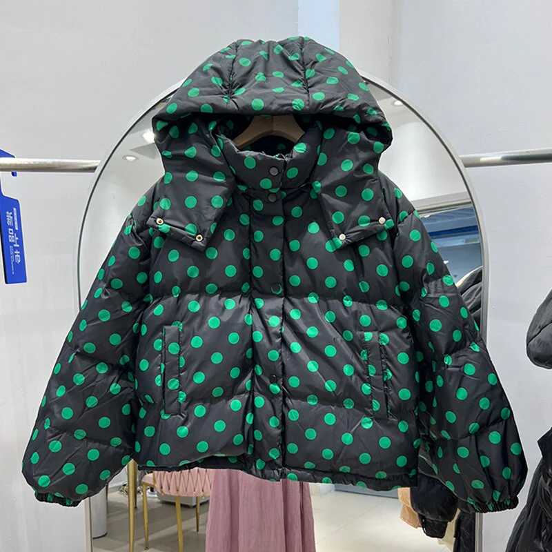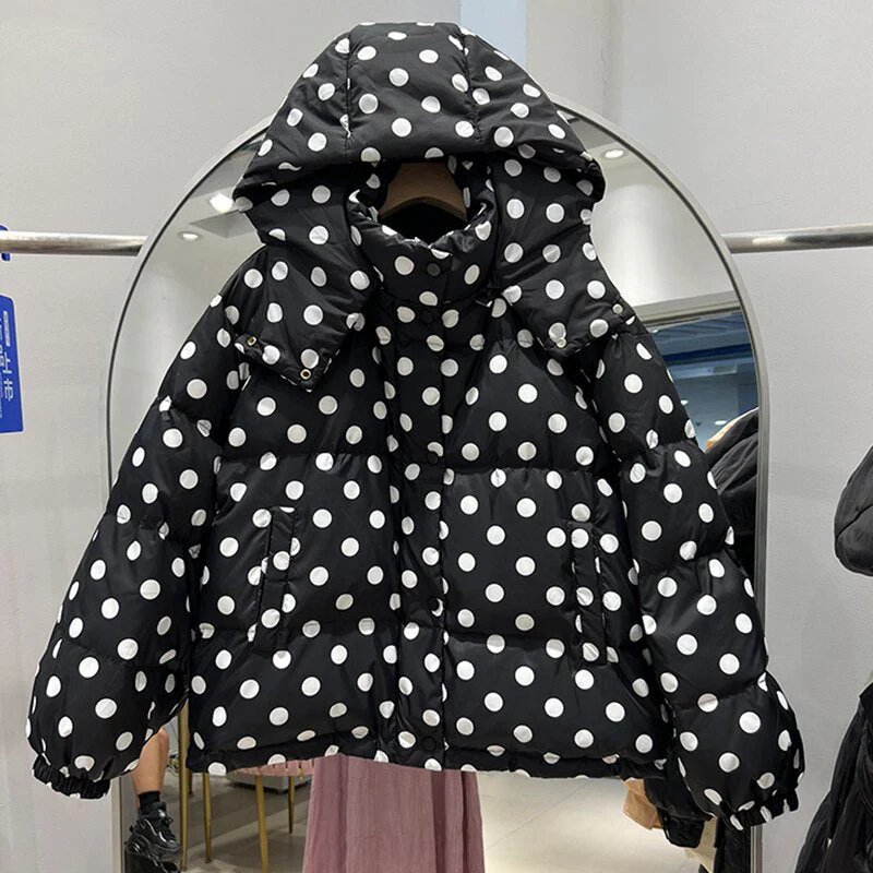 Black Friday Sales New Winter Women Vintage Polka Dot Thick Warm 90% White Duck Down Jacket Hooded Loose Female Down Coat Snow Outwear