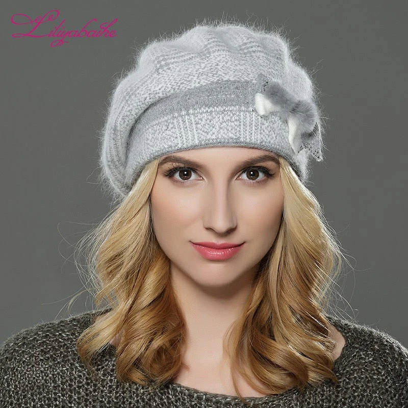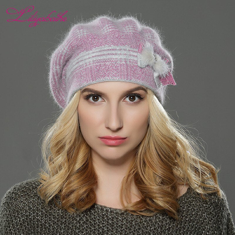 Christmas Gift NEW winterWomen beret hat knitted wool angora beret The classic grid of mink flower decoration cap Double warm hat