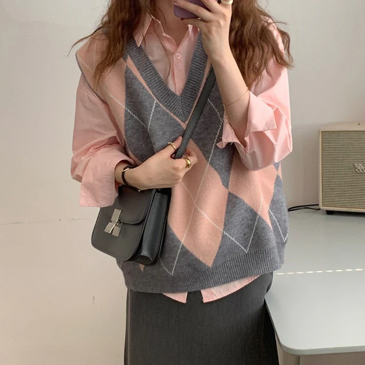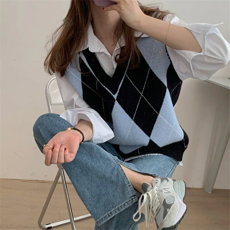 Christmas Gift Deanwangkt New Autunm Winter Women Sweater Pullover Vest Sleeveless Oversized Knitted Checkered Vintage Lady Tops SWV1397JX