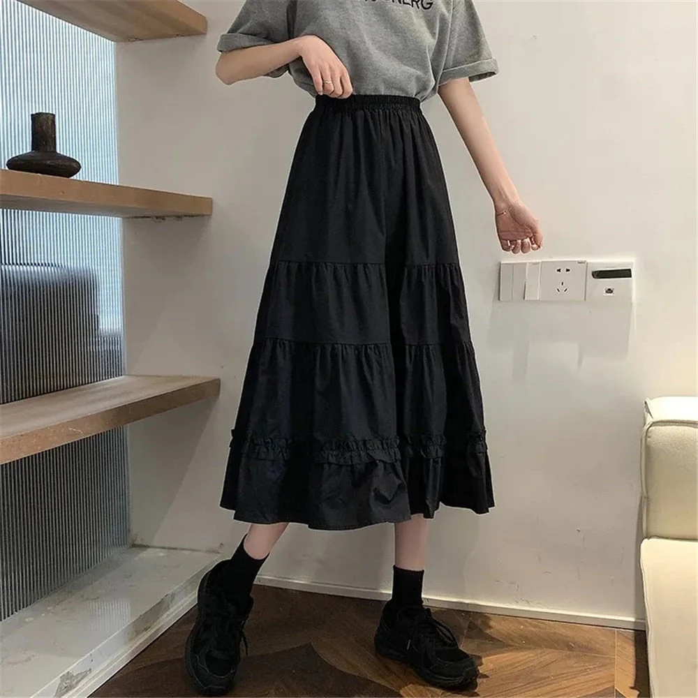 Black Goth Lolita Long Pleated Skirt Women Ruffles Vintage High Waist Harajuku Midi Skirt Summer Korean Patchwork Streetwear