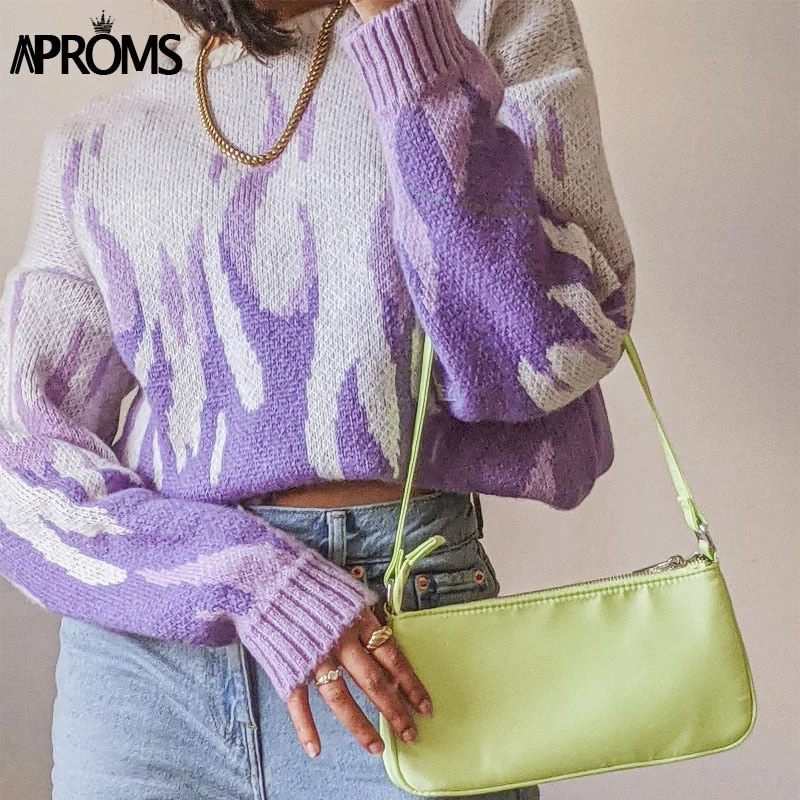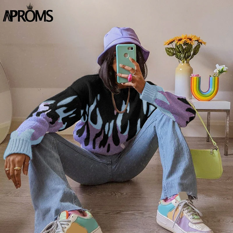 Christmas Gift Aproms Vintage Purple Flame Knitted Oversized Sweaters Women Winter Streetwear Warm Pullovers High Fashion Stretch Jumpers Deanwangkt