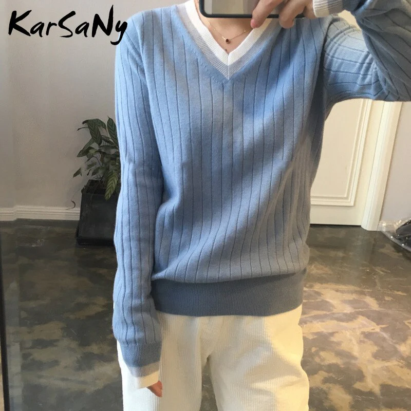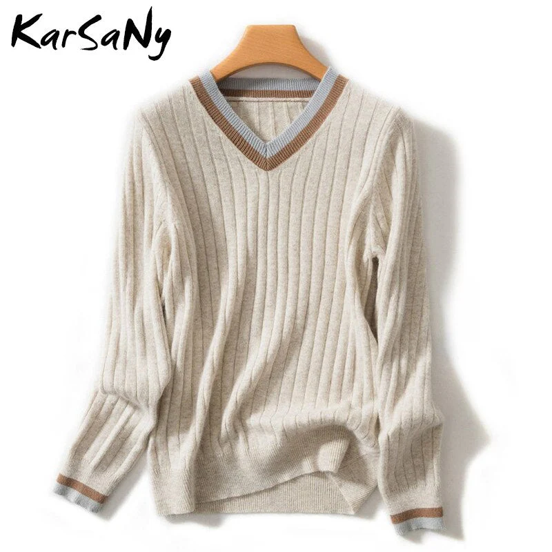 Christmas Gift Autumn V-neck Cashmere Sweater Women Vintage Jumper Blue Knitted Striped Sweaters For Women White Sweater Pullover Winter Warm