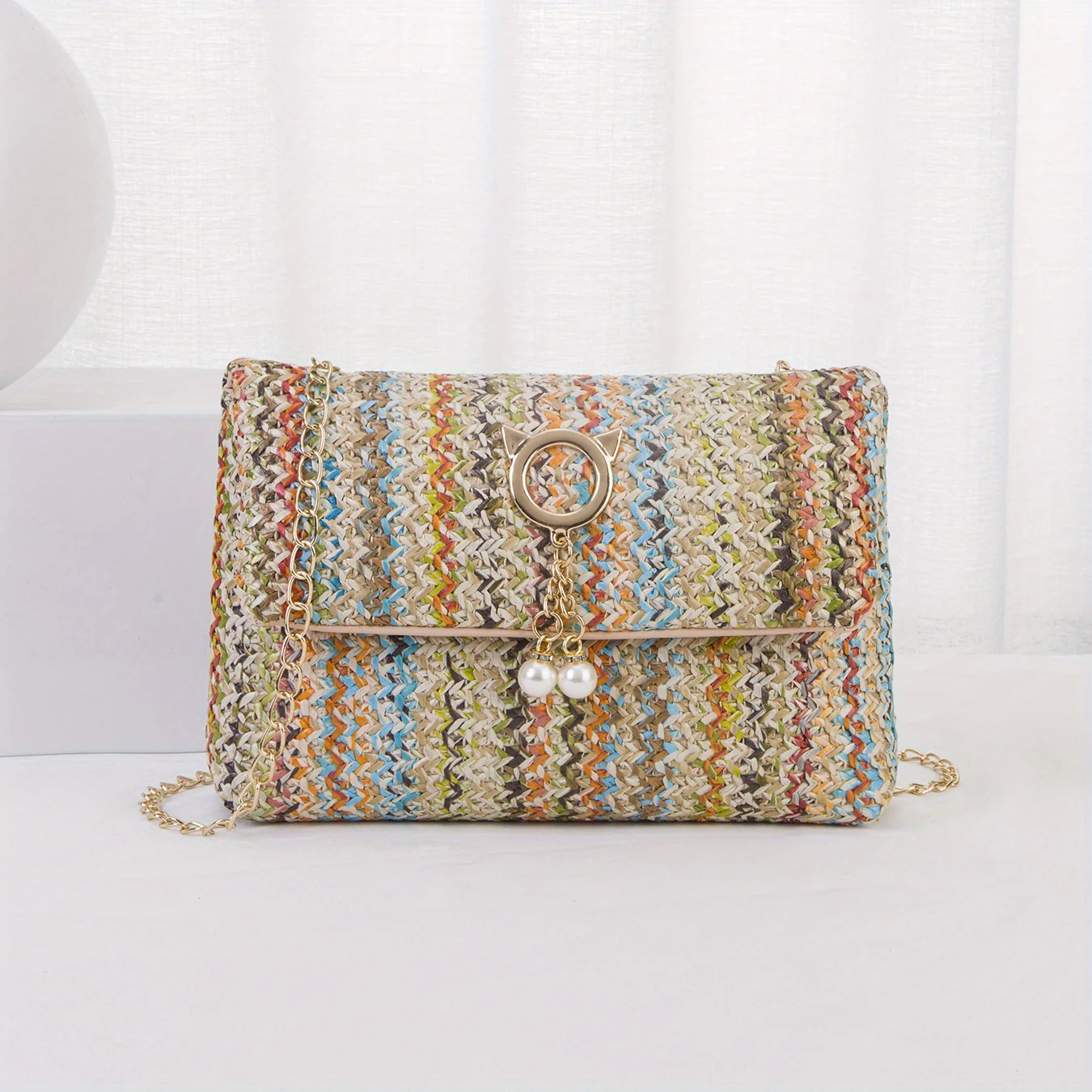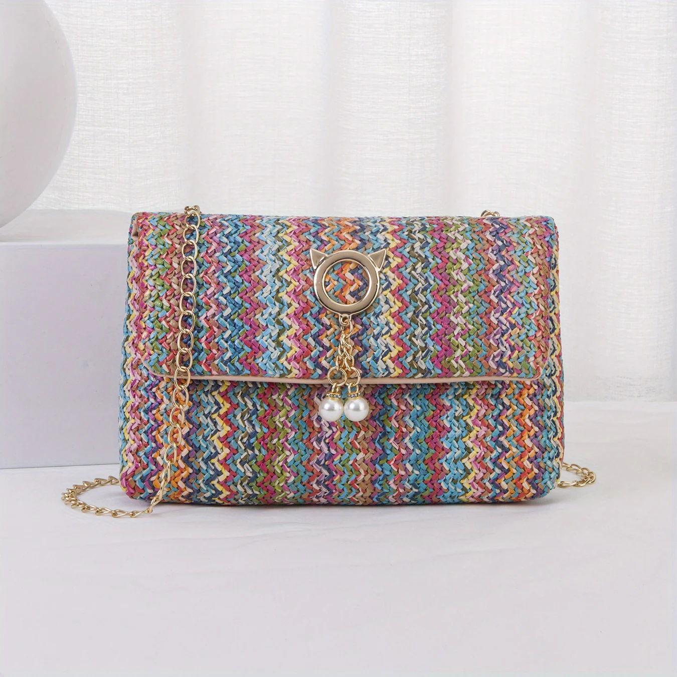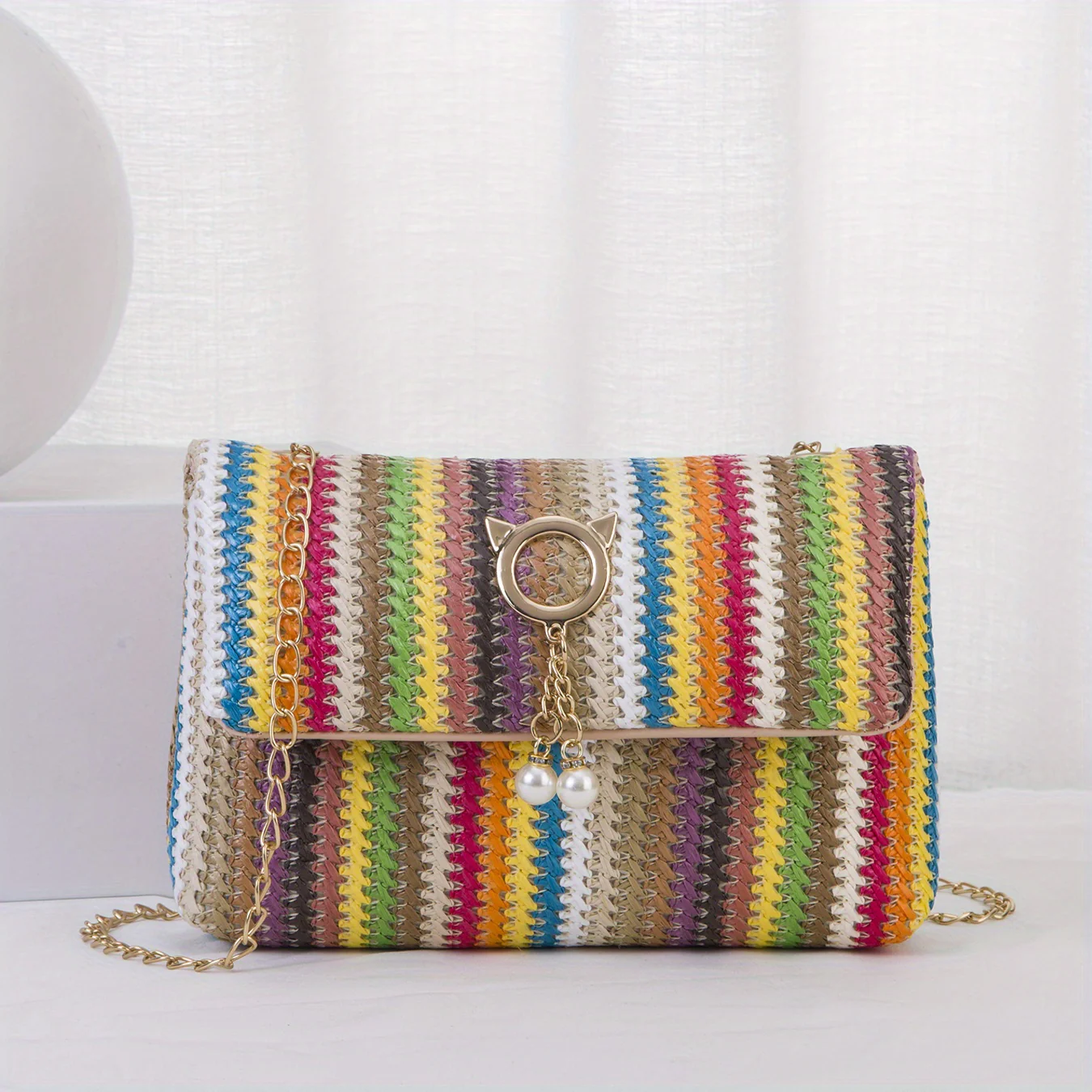 deanwangkt-1 Rainbow Straw Woven Beach Bag, Fashion Chain Crossbody Bag, Colorful Stripes Square Purse