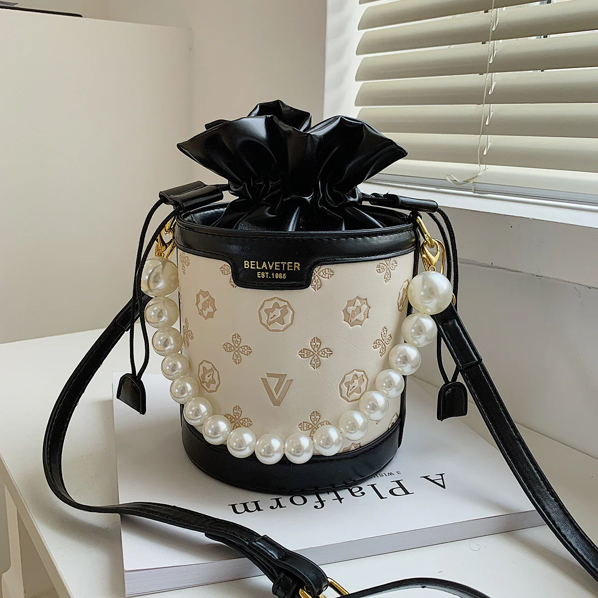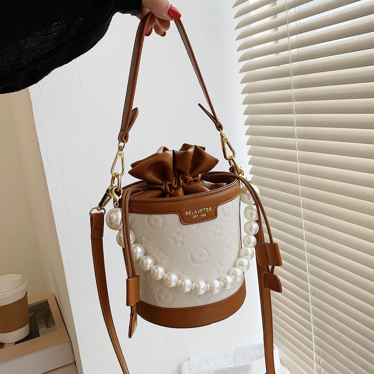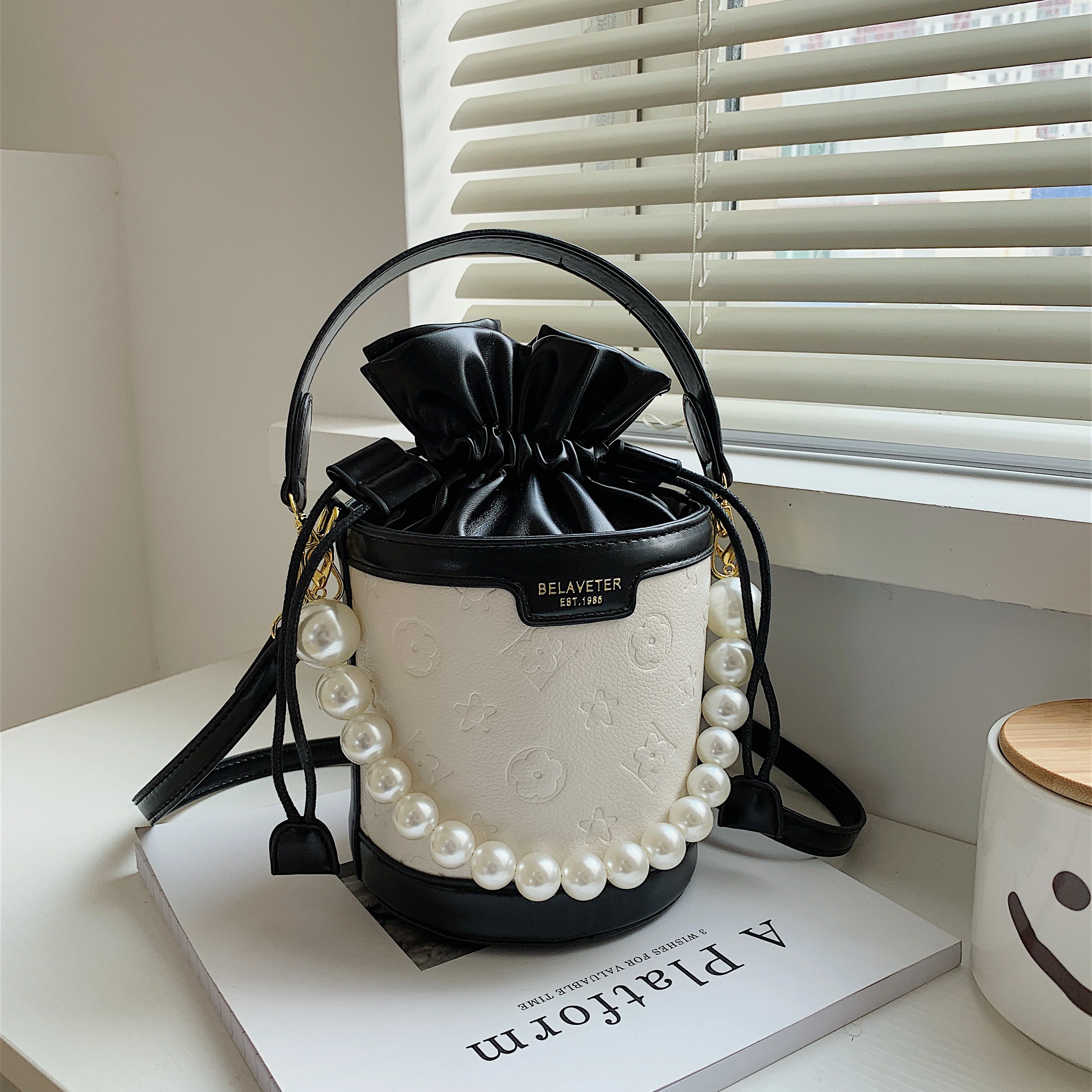 Women's Embossed Bucket Bag, Pearl Chain Crossbody Bag, Mini Top Handle Drawstring Purse (5.5*7.9) Inch