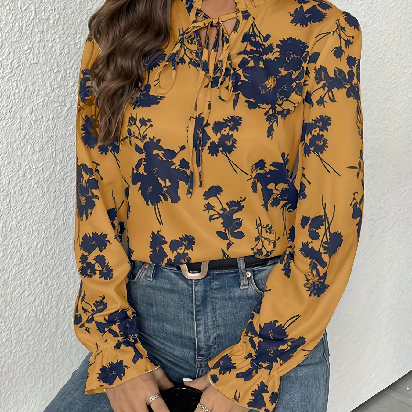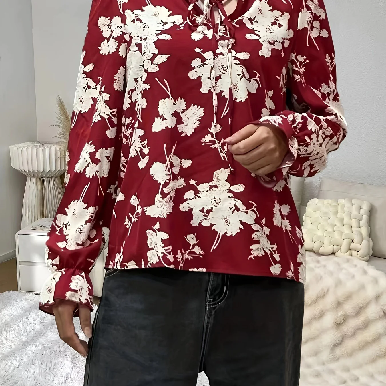 Floral Print Tie Front Blouse, Elegant V Neck Long Sleeve Blouse, Women's Clothing