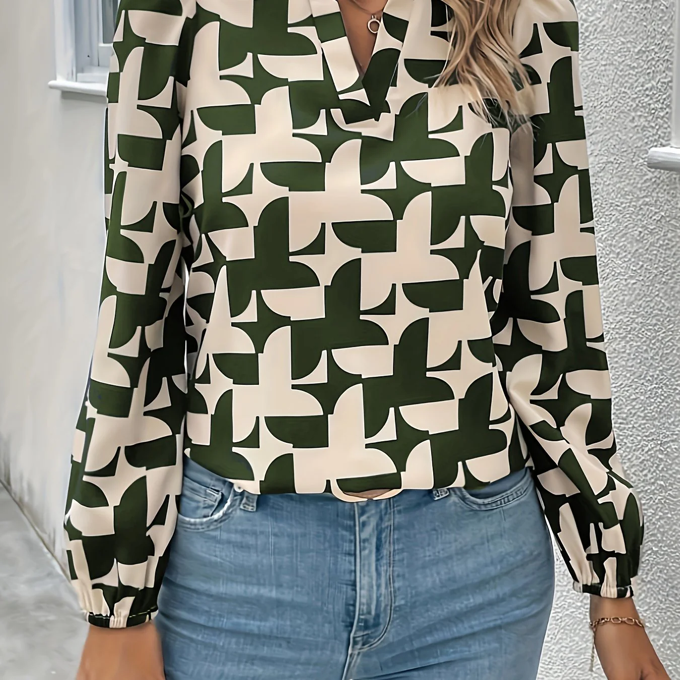 Graphic Print Notched Neck Blosue, Elegant Long Sleeve Blouse For Spring & Fall, Women's Clothing