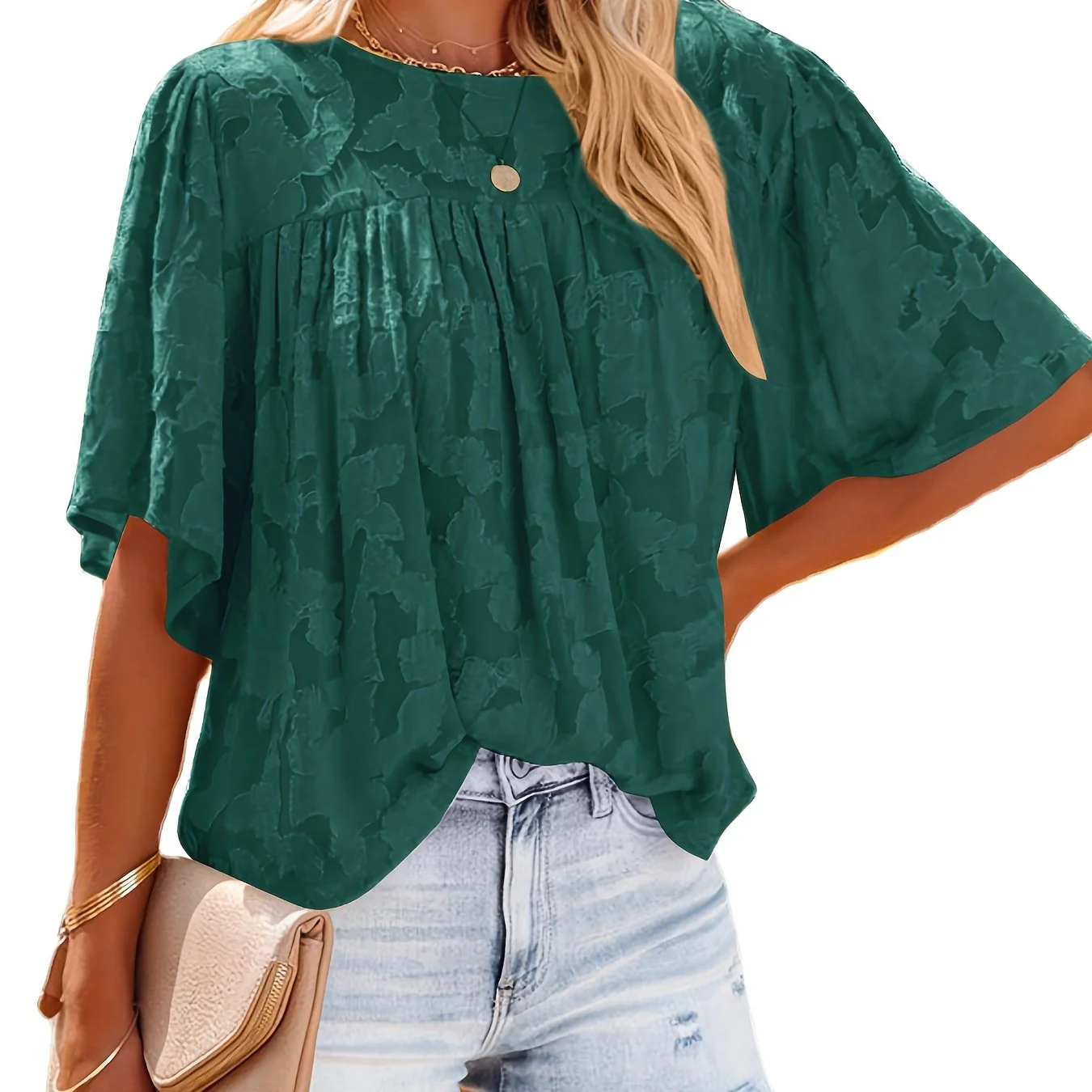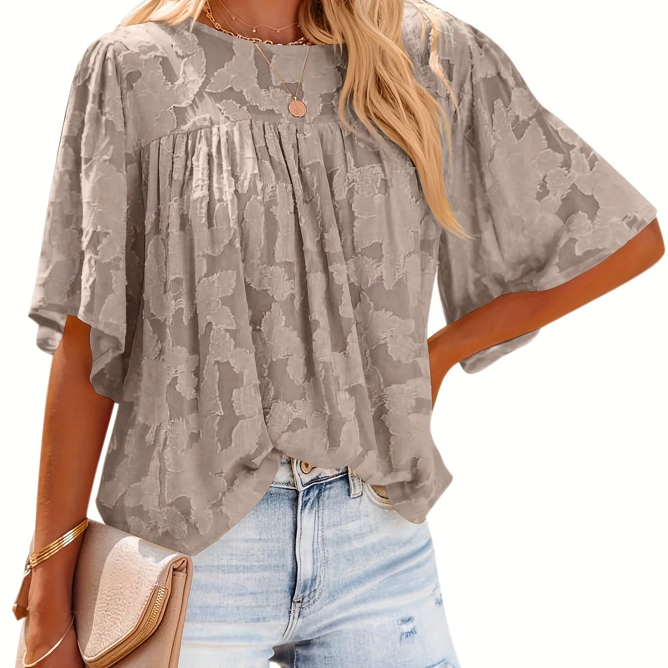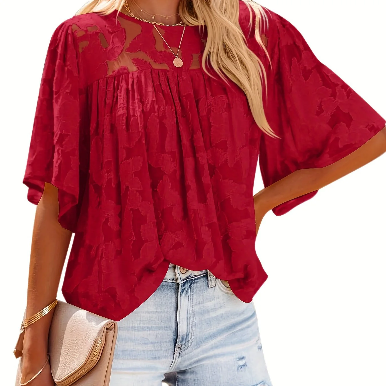 Casual Lace Flare Sleeve Blouse, Short Sleeve Crew Neck Solid Blouse, Casual Every Day Tops, Women's Clothing