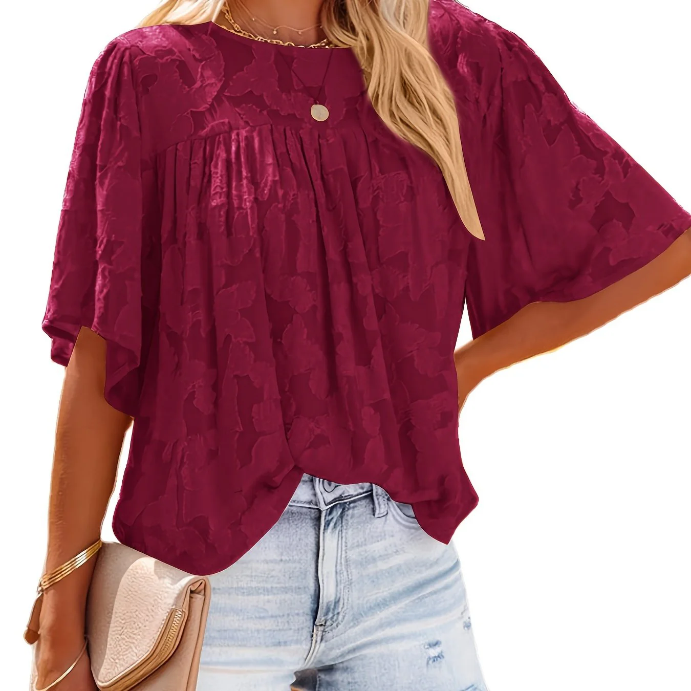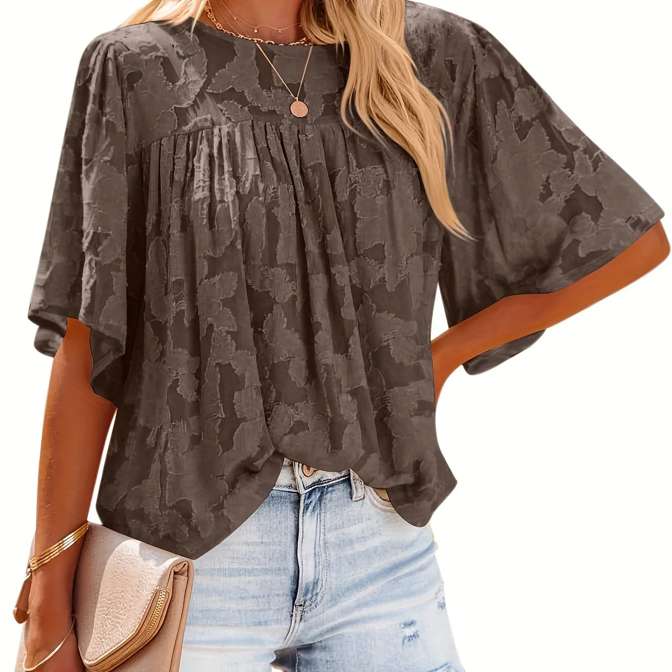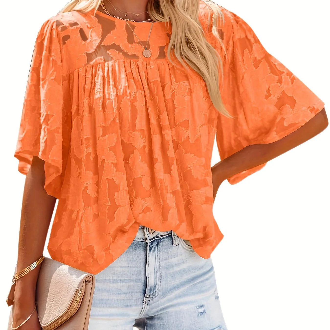 Casual Lace Flare Sleeve Blouse, Short Sleeve Crew Neck Solid Blouse, Casual Every Day Tops, Women's Clothing