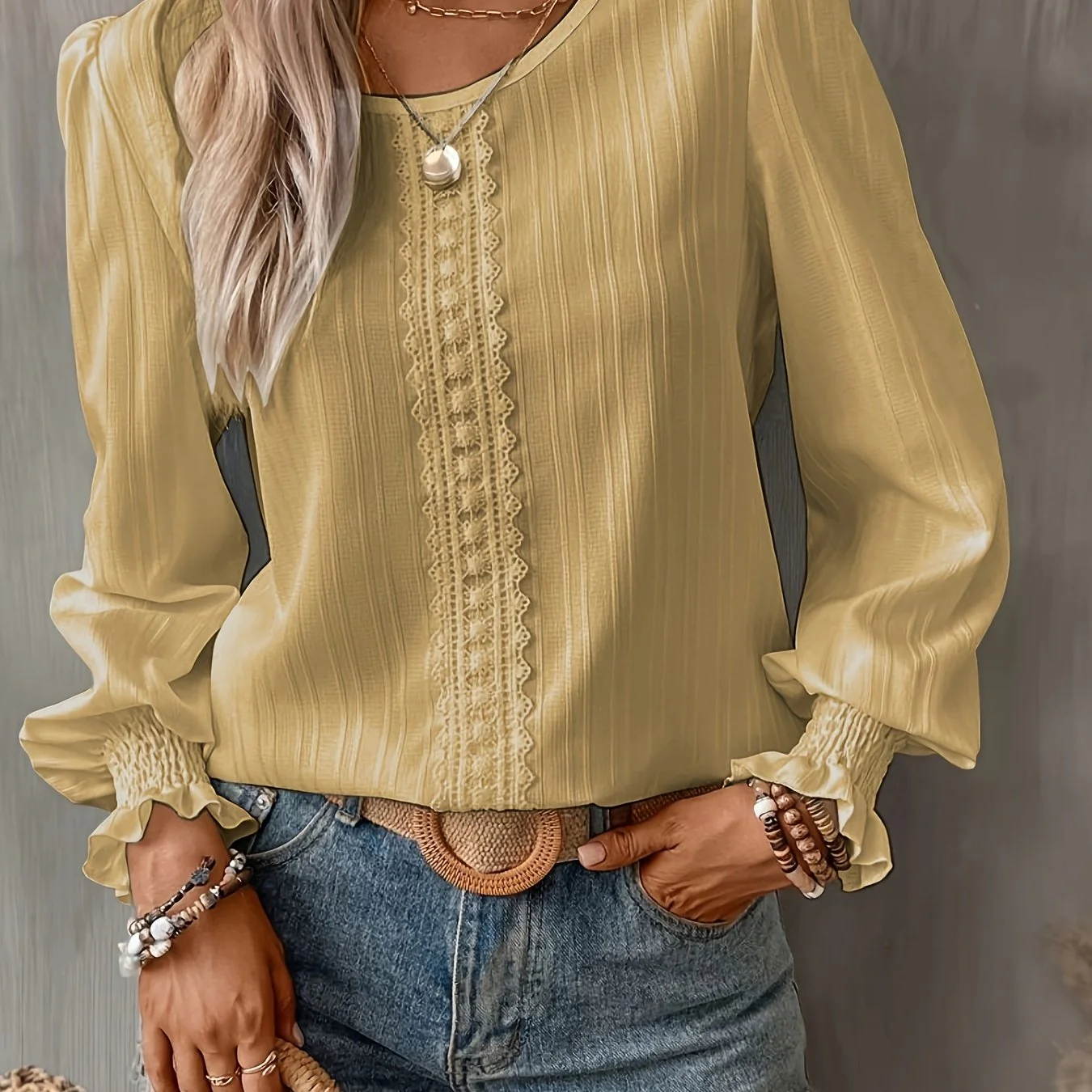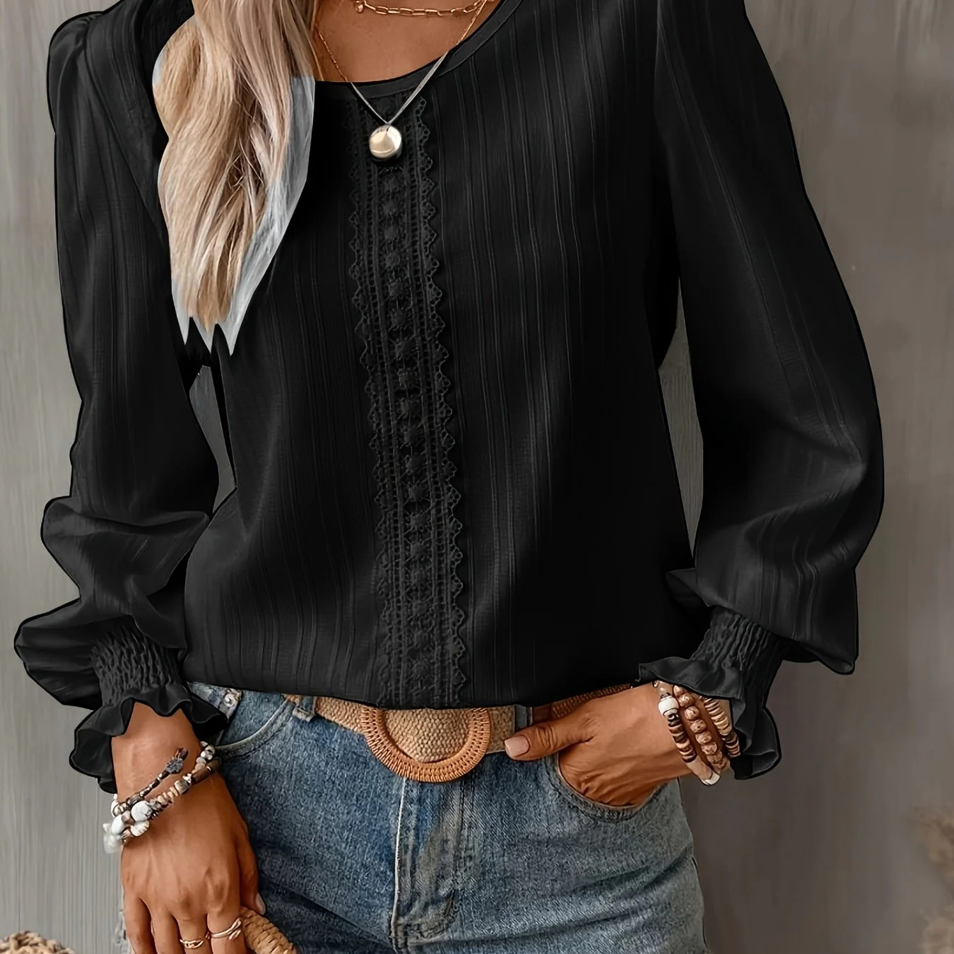 Contrast Lace Solid Blouse, Elegant Crew Neck Lantern Sleeve Blouse, Women's Clothing