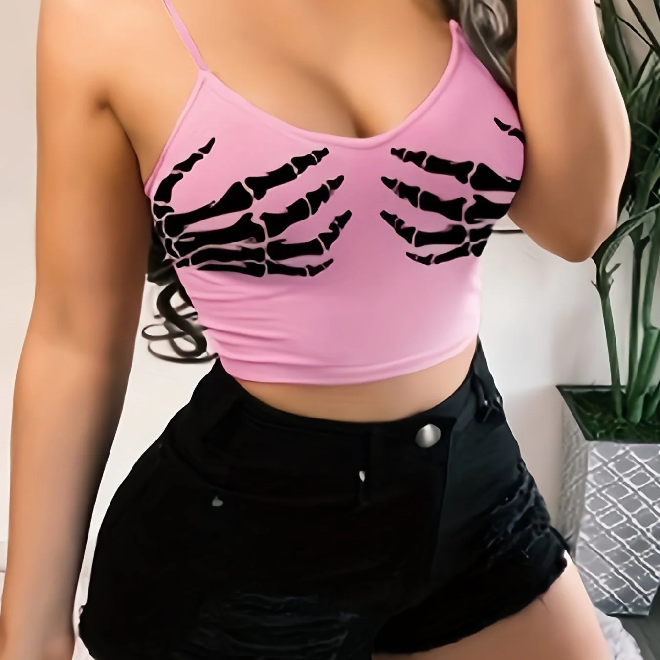deanwangkt-1 Grunge Skeleton Print Spaghetti Top, Sexy Sleeveless Cropped Summer Top, Women's Clothing