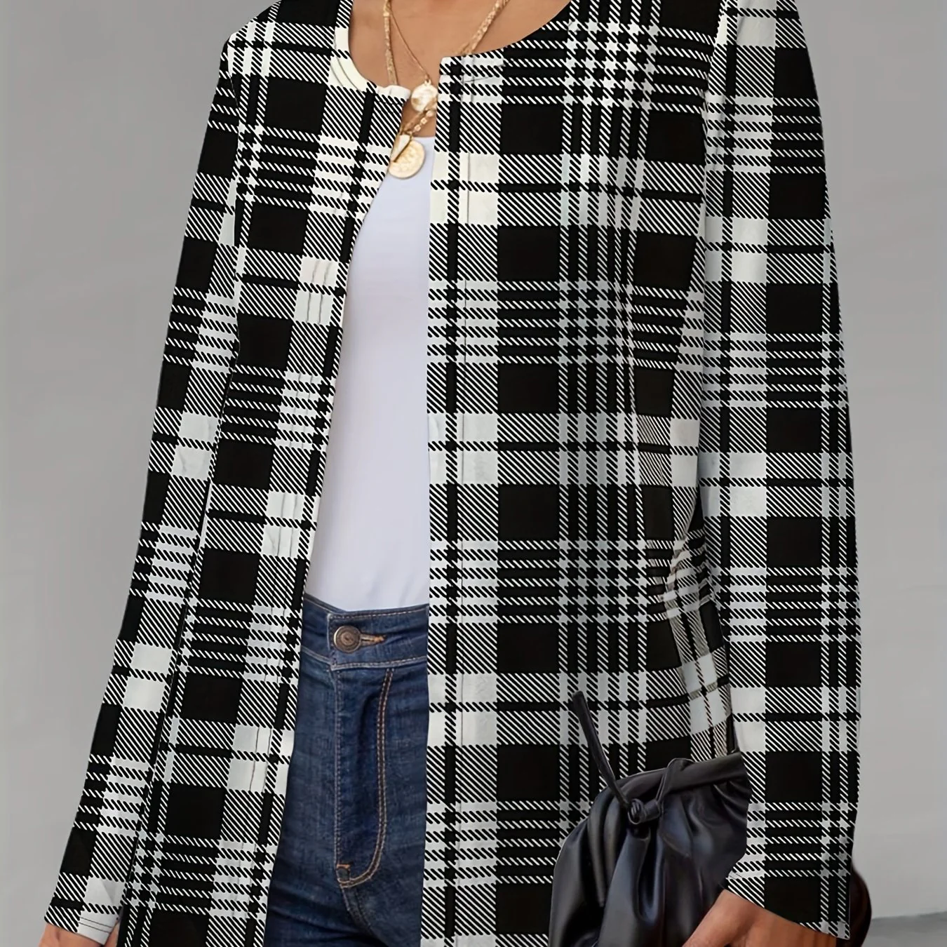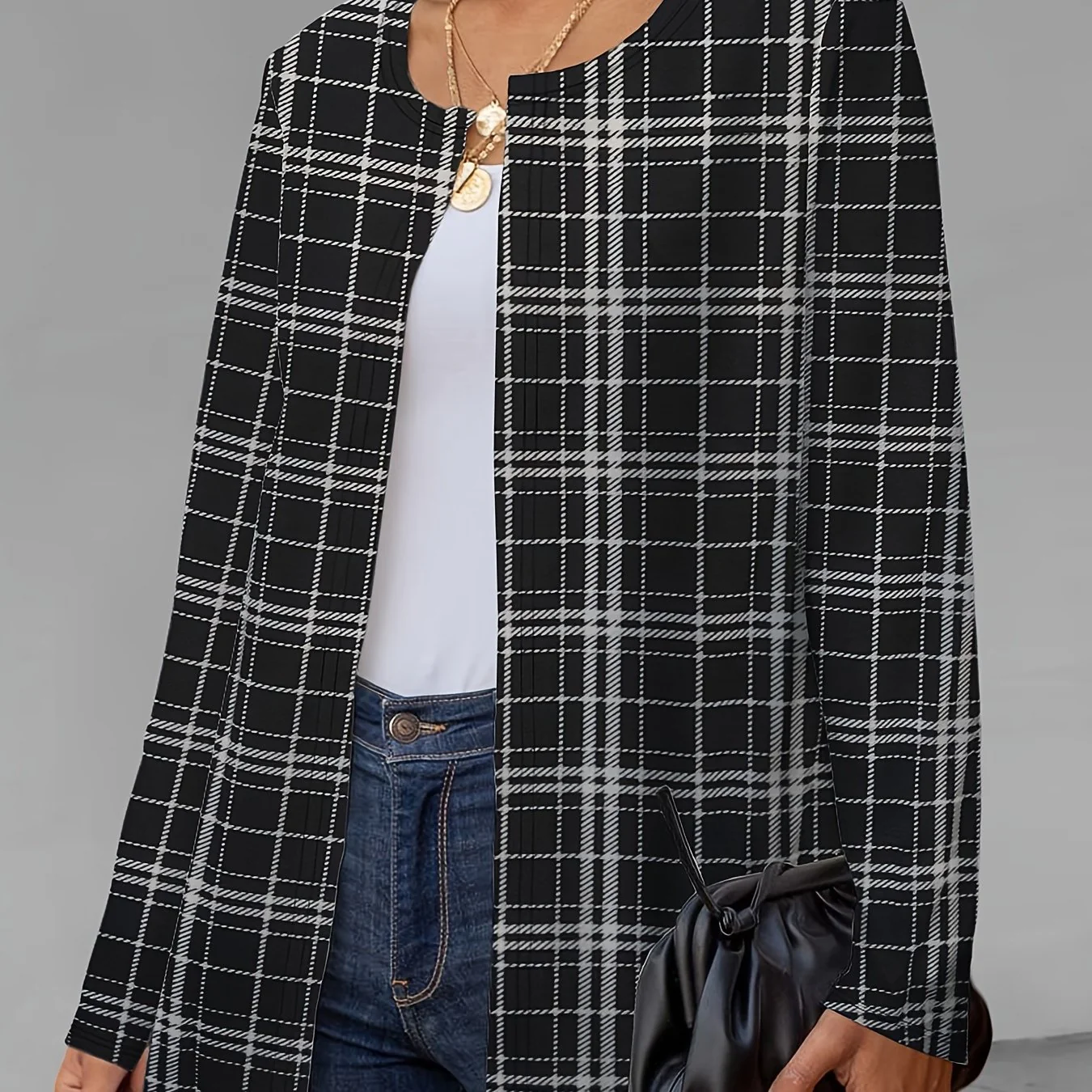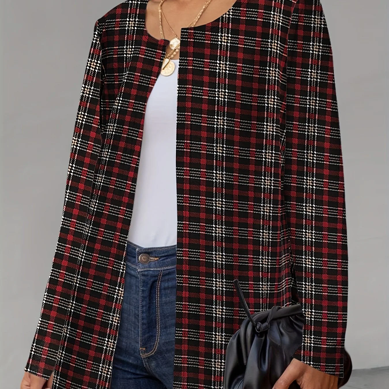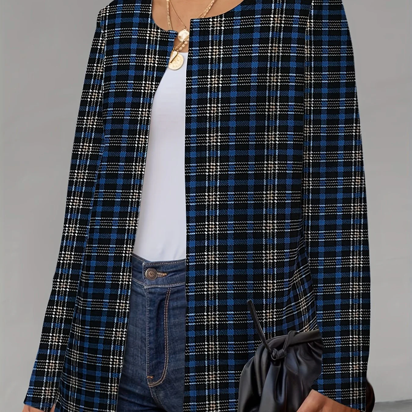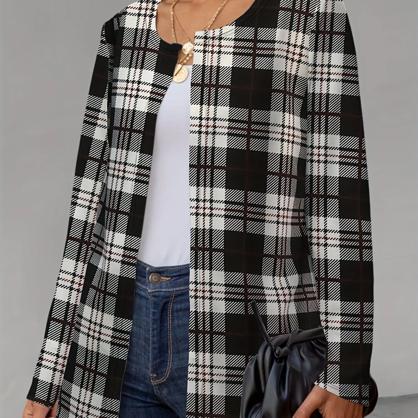 deanwangkt-1 Plaid Print Crew Neck Jacket, Casual Long Sleeve Outerwear For Fall, Women's Clothing
