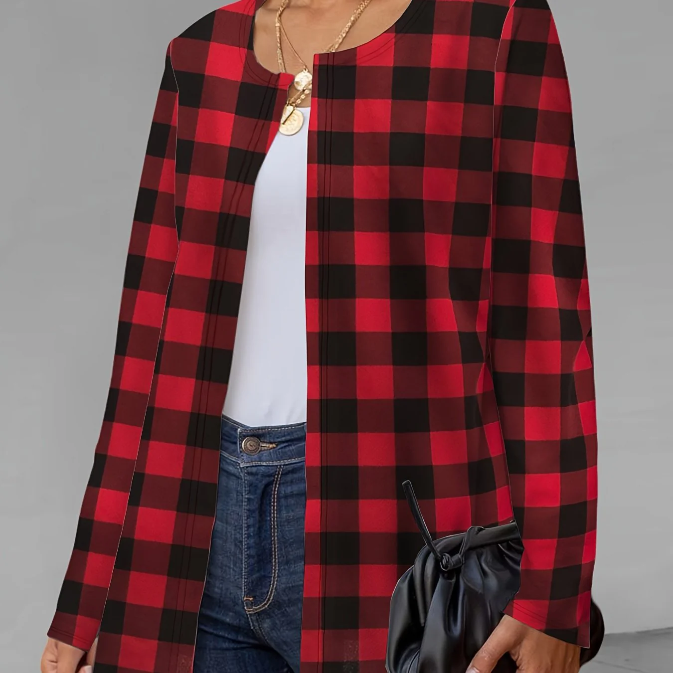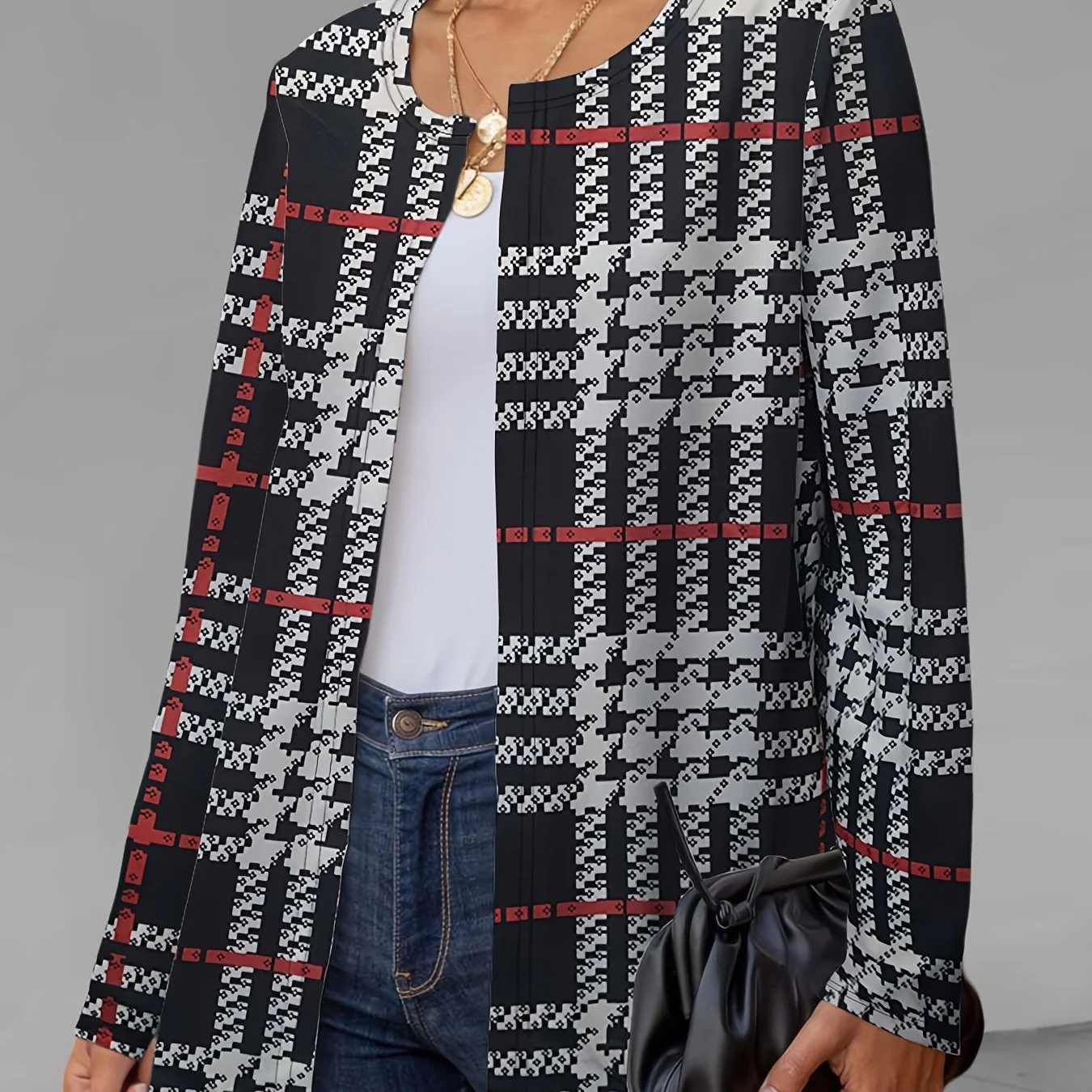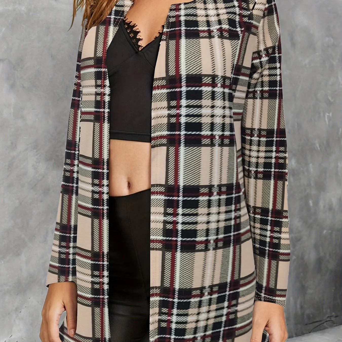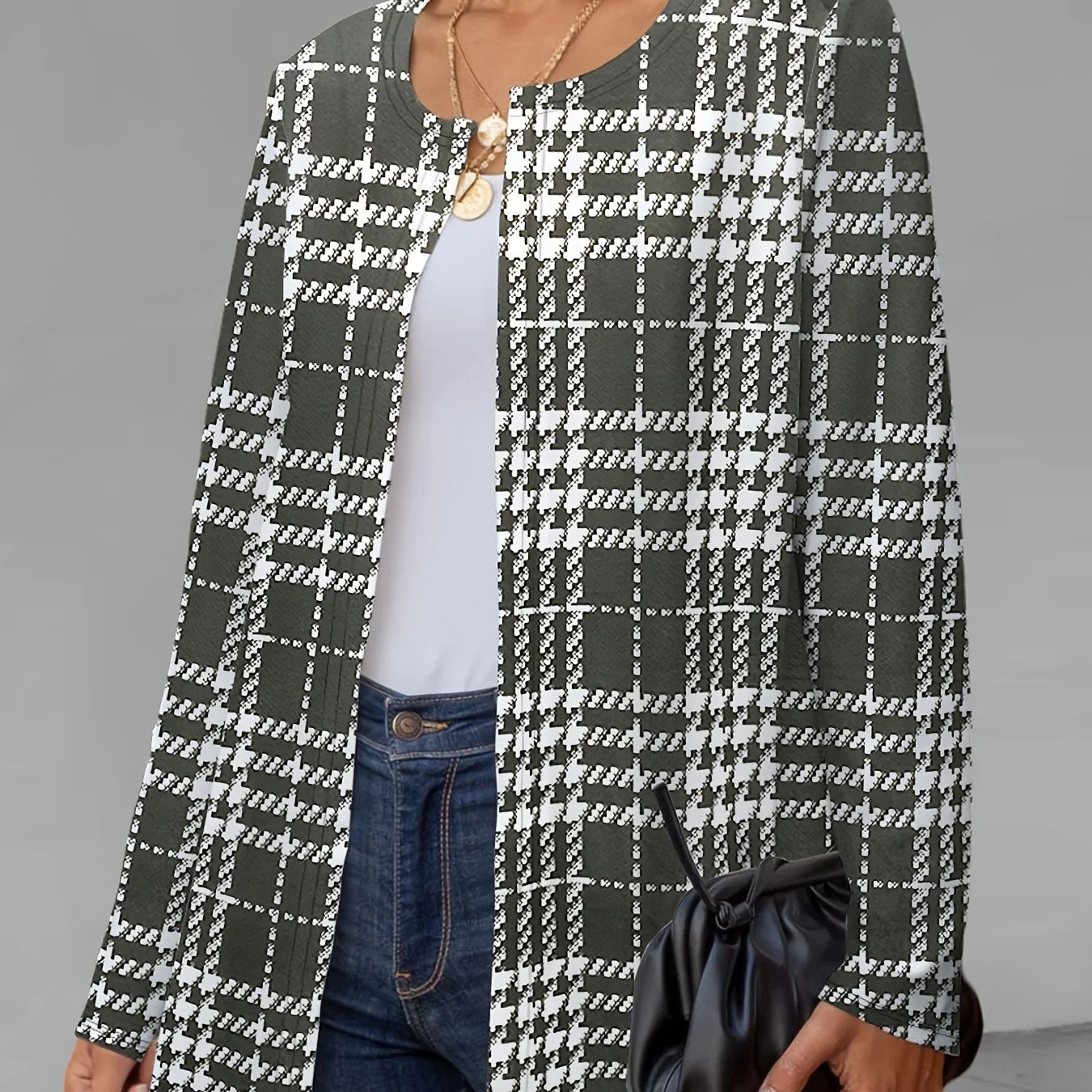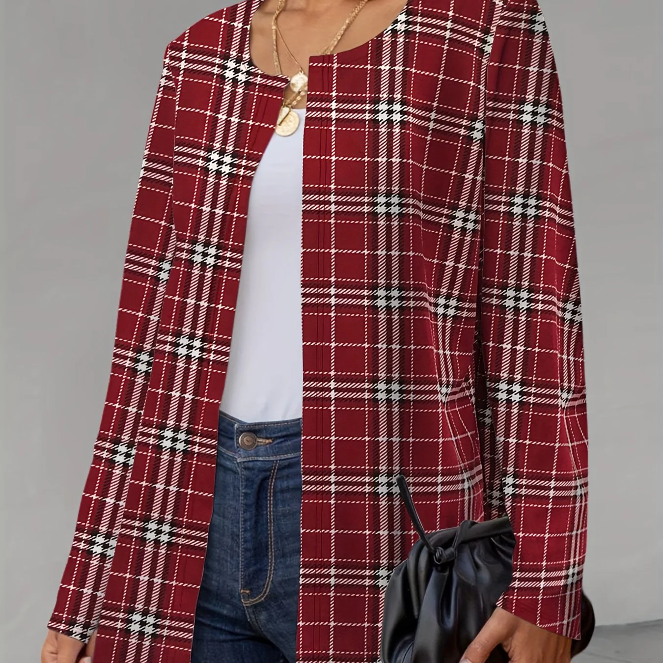 deanwangkt-1 Plaid Print Crew Neck Jacket, Casual Long Sleeve Outerwear For Fall, Women's Clothing