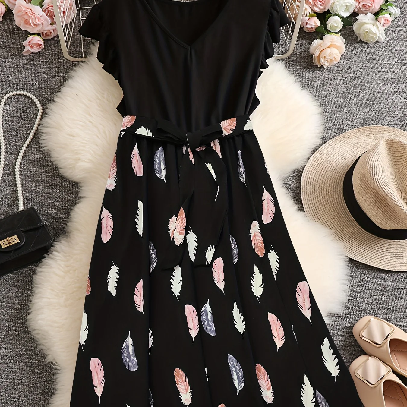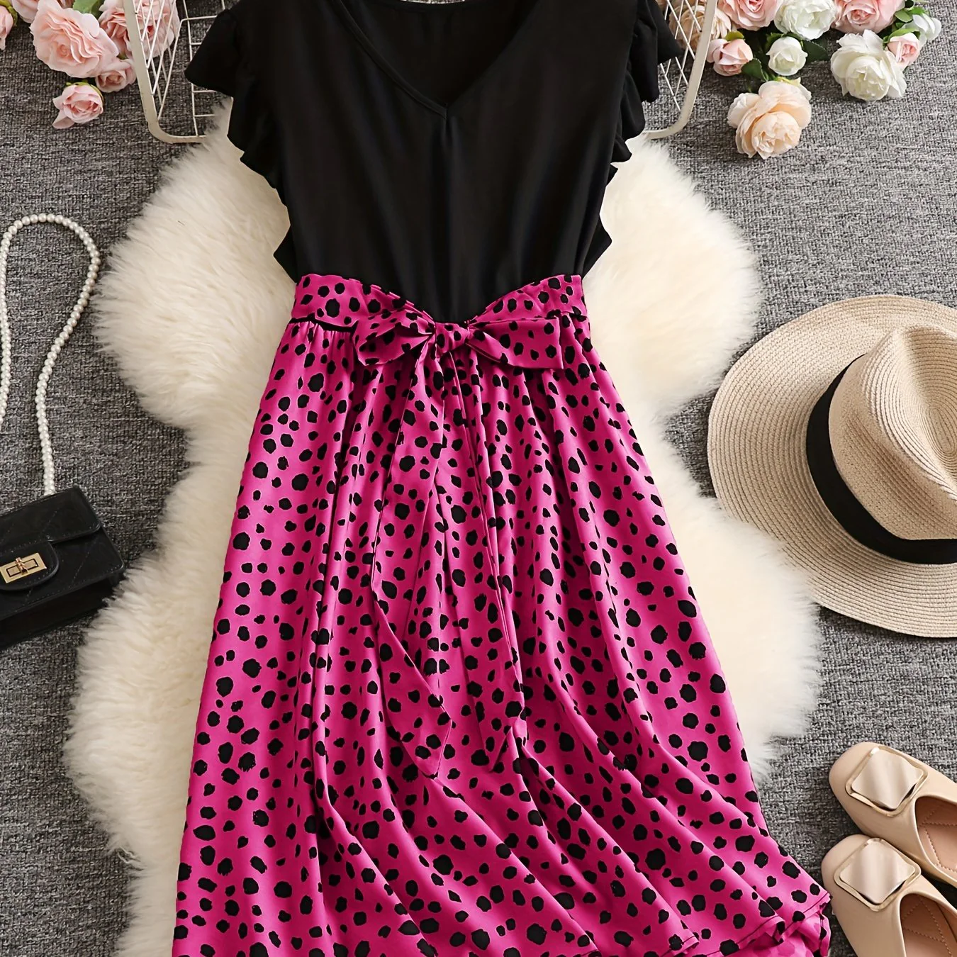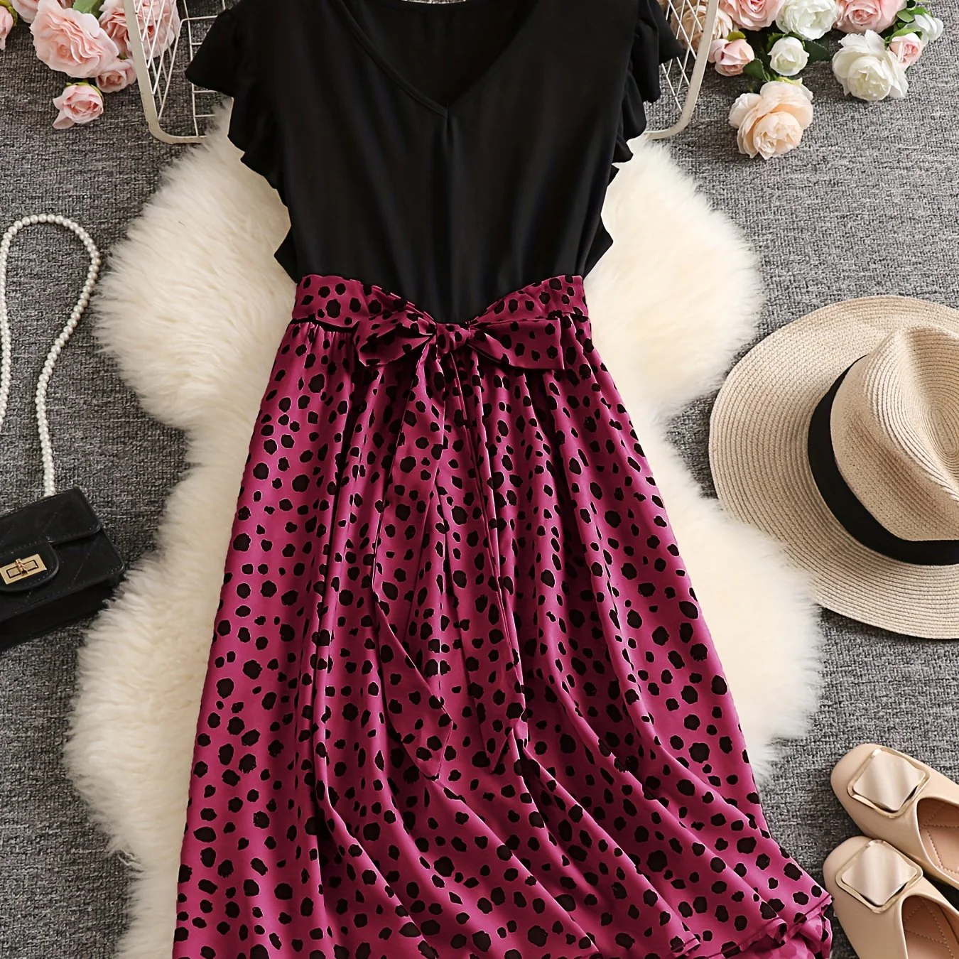 Plus Size Casual Dress, Women's Plus Colorblock Leopard Print Ruffle Sleeve V Neck Medium Stretch Belted Dress