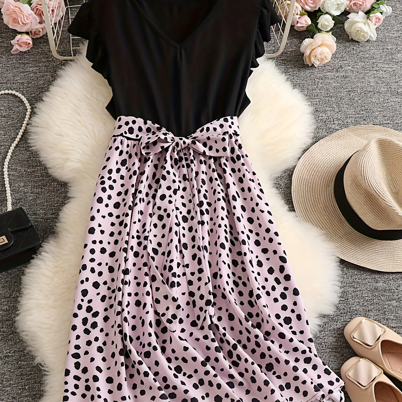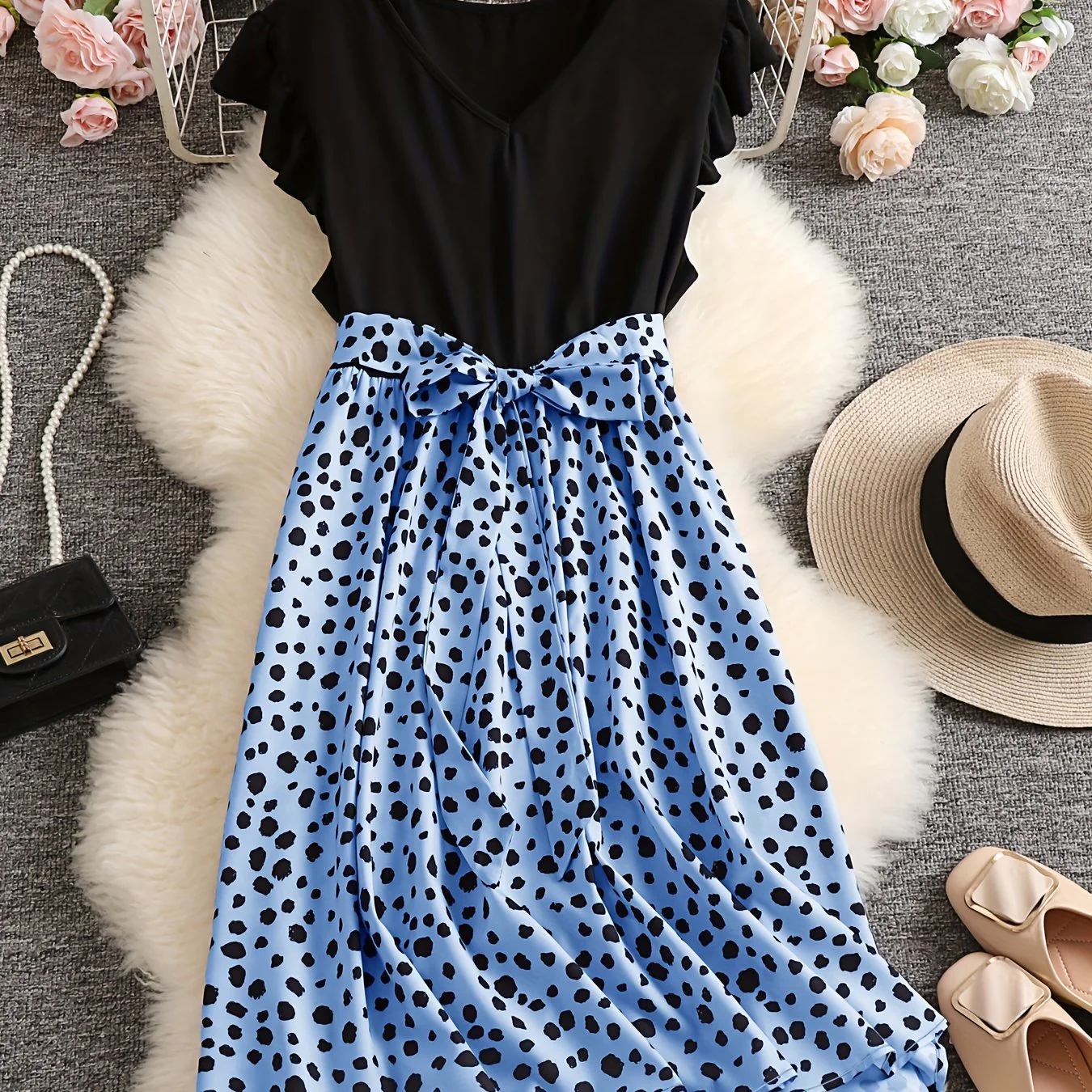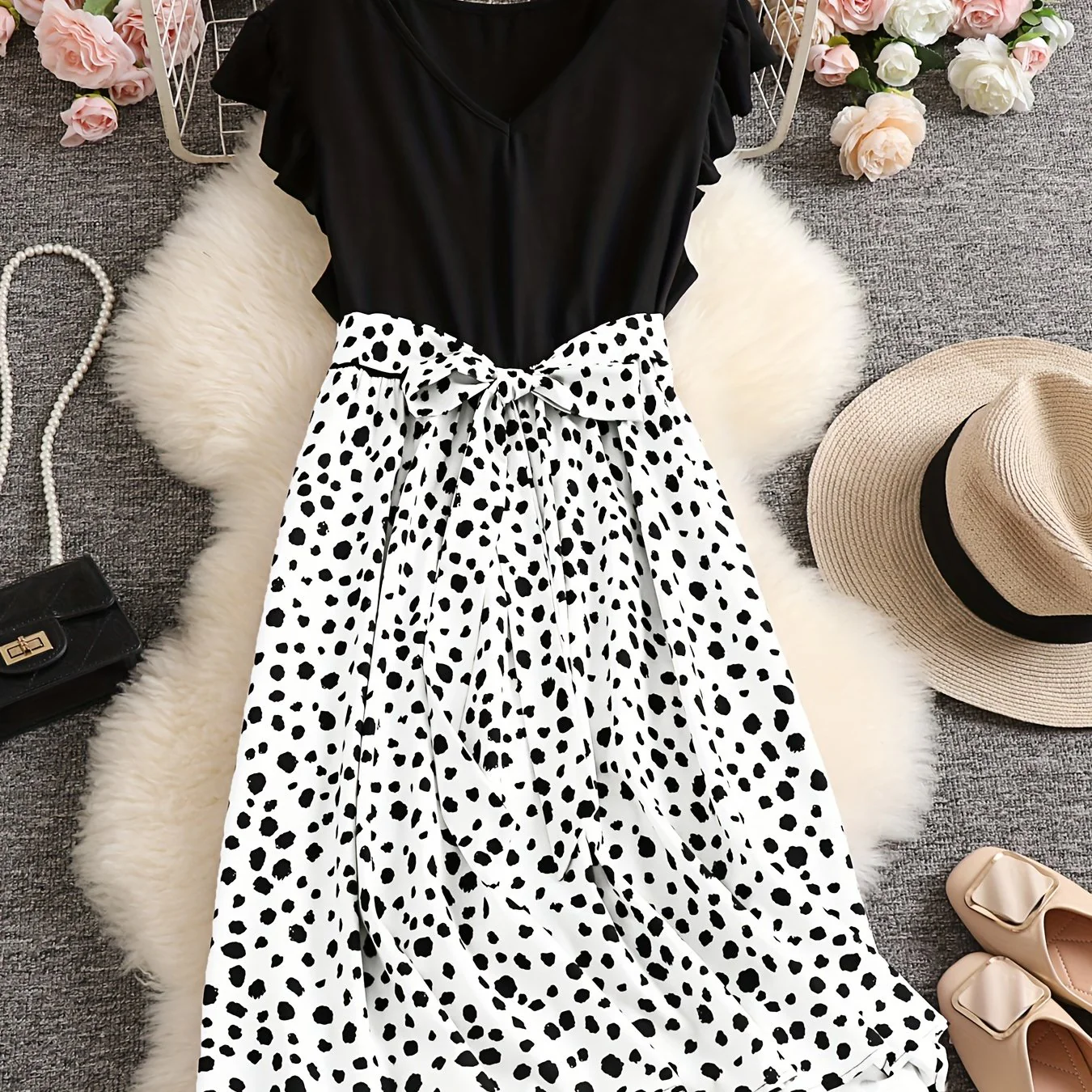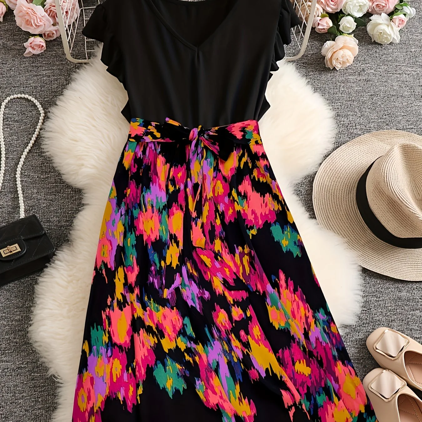 Plus Size Casual Dress, Women's Plus Colorblock Leopard Print Ruffle Sleeve V Neck Medium Stretch Belted Dress