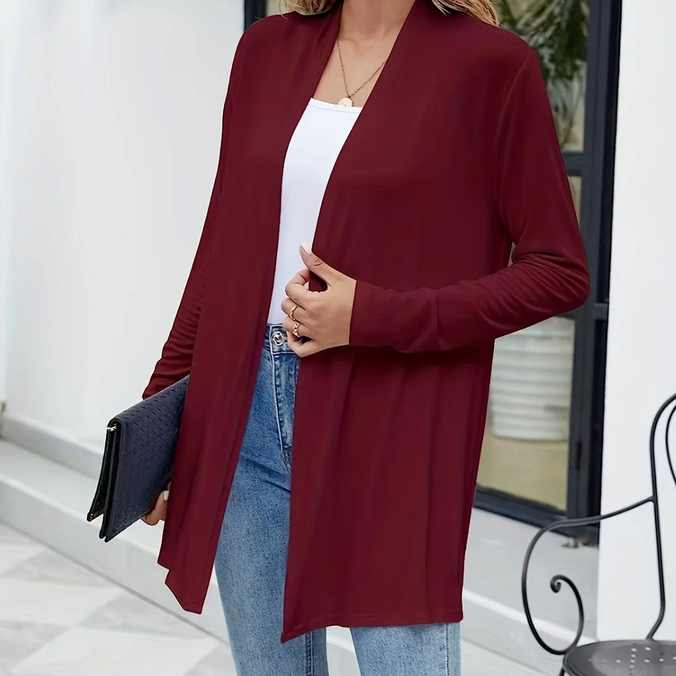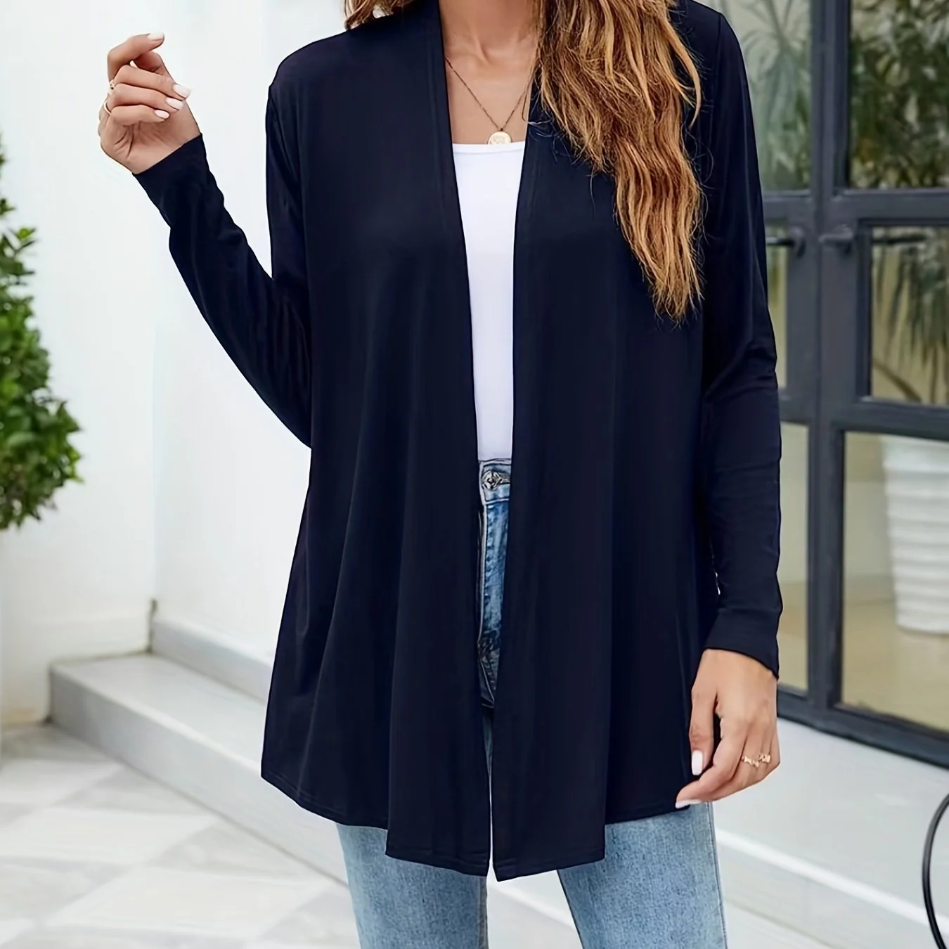 deanwangkt-1 Solid Open Front Cardigan, Casual Long Sleeve Cardigan For Spring & Fall, Women's Clothing