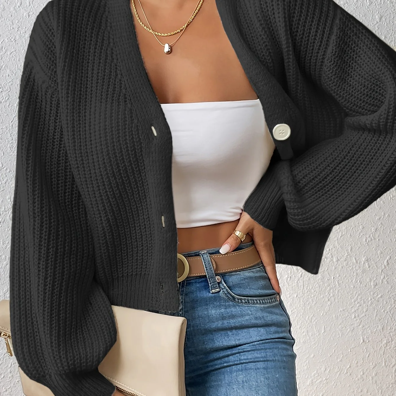 Solid Button Front Knitted Cardigans, Casual Long Lantern Sleeve Cardigan For Fall & Winter, Women's Clothing