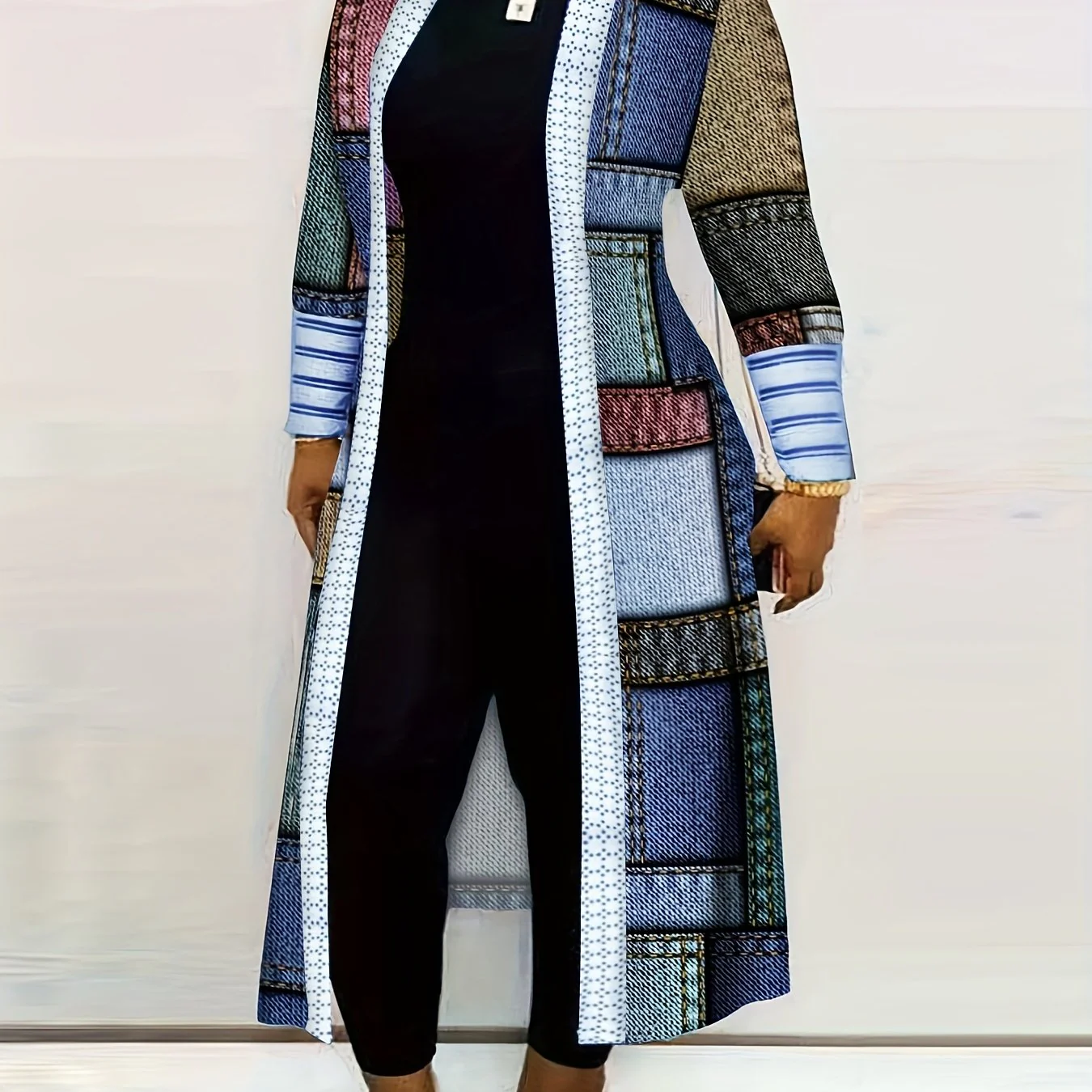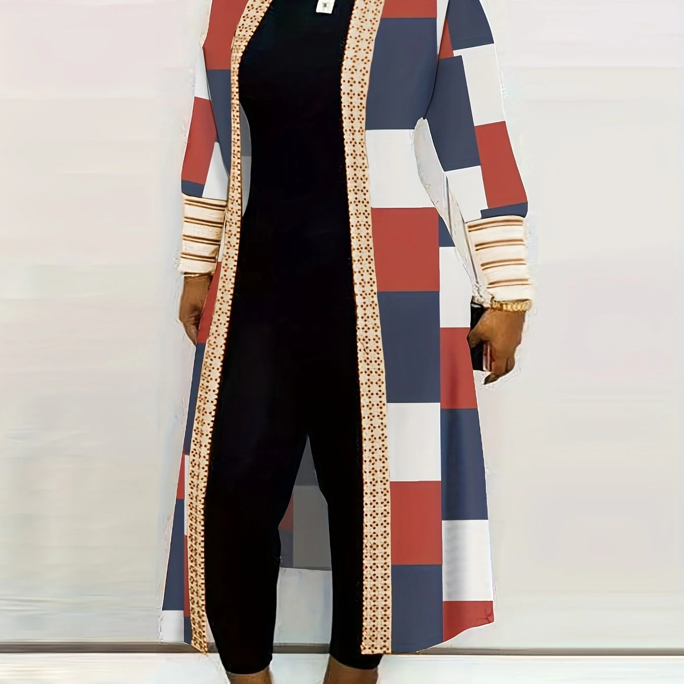 Plus Size Colorblock Longline Coat, Women's Plus Slight Stretch Casual Trench Coat