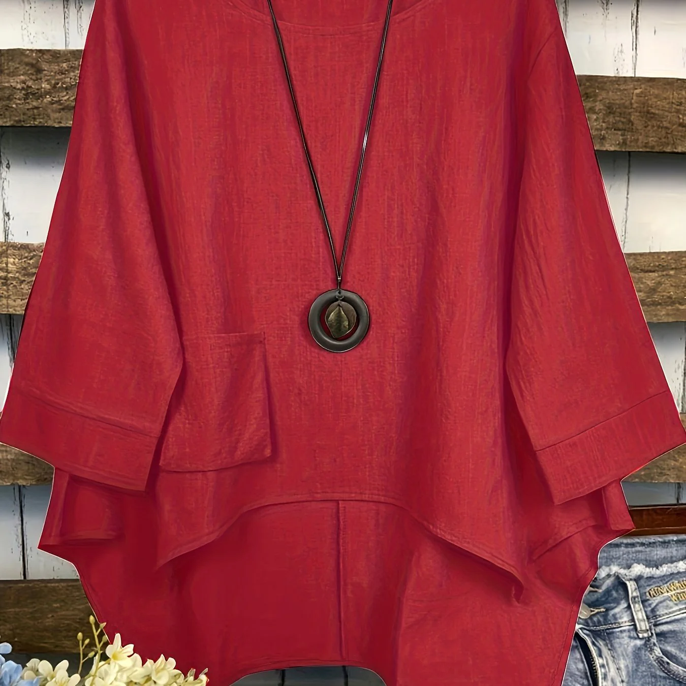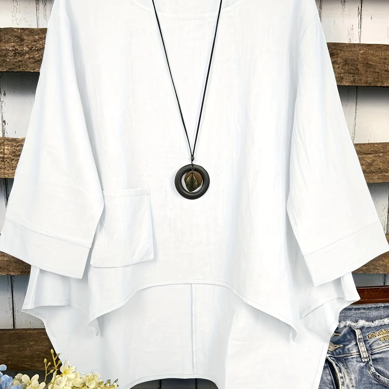Dipped Hem Solid Blouse, Asymmetrical Crew Neck Loose Casual Blouse, Women's Clothing