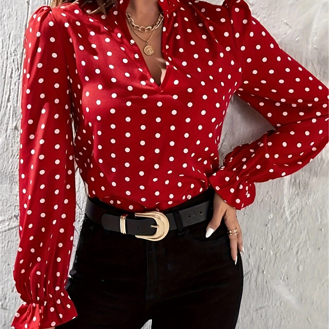 Polka-dot Print Notched Neck Blouse, Versatile Puff Sleeve Blouse For Spring & Fall, Women's Clothing