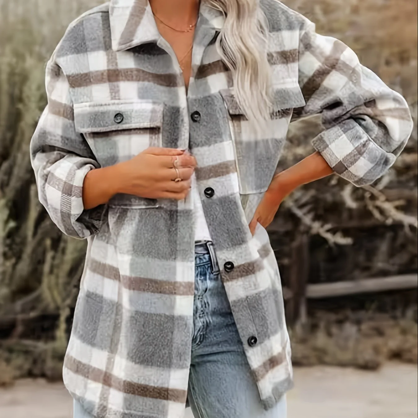 Stylish Plaid Button Down Long Sleeve Jacket, Loose Lapel Plaid Jacket, Women's Clothing
