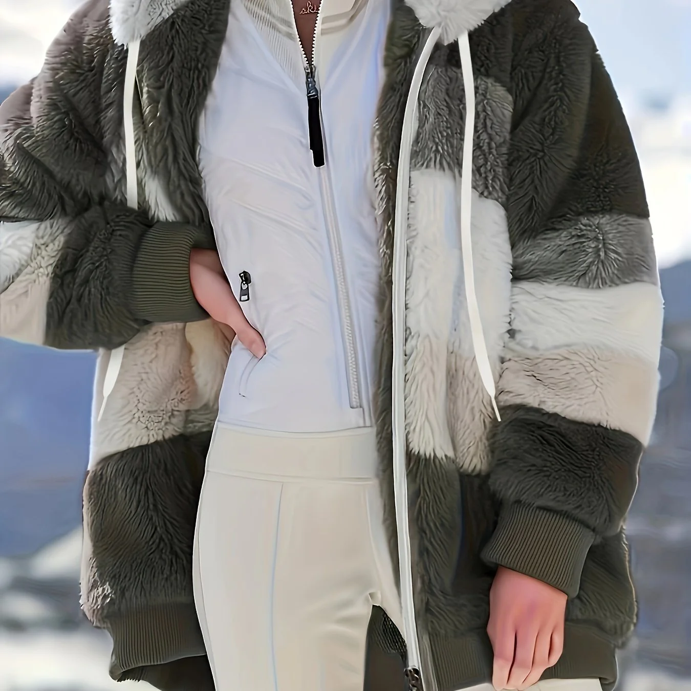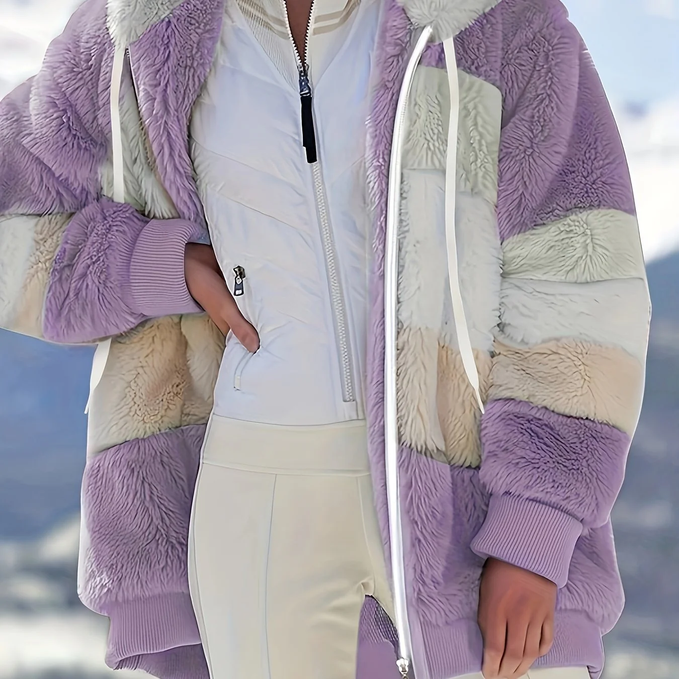 Color Block Hooded Teddy Coat, Casual Zip Up Long Sleeve Winter Warm Outerwear, Women's Clothing