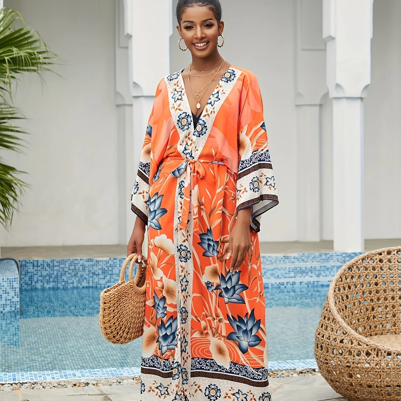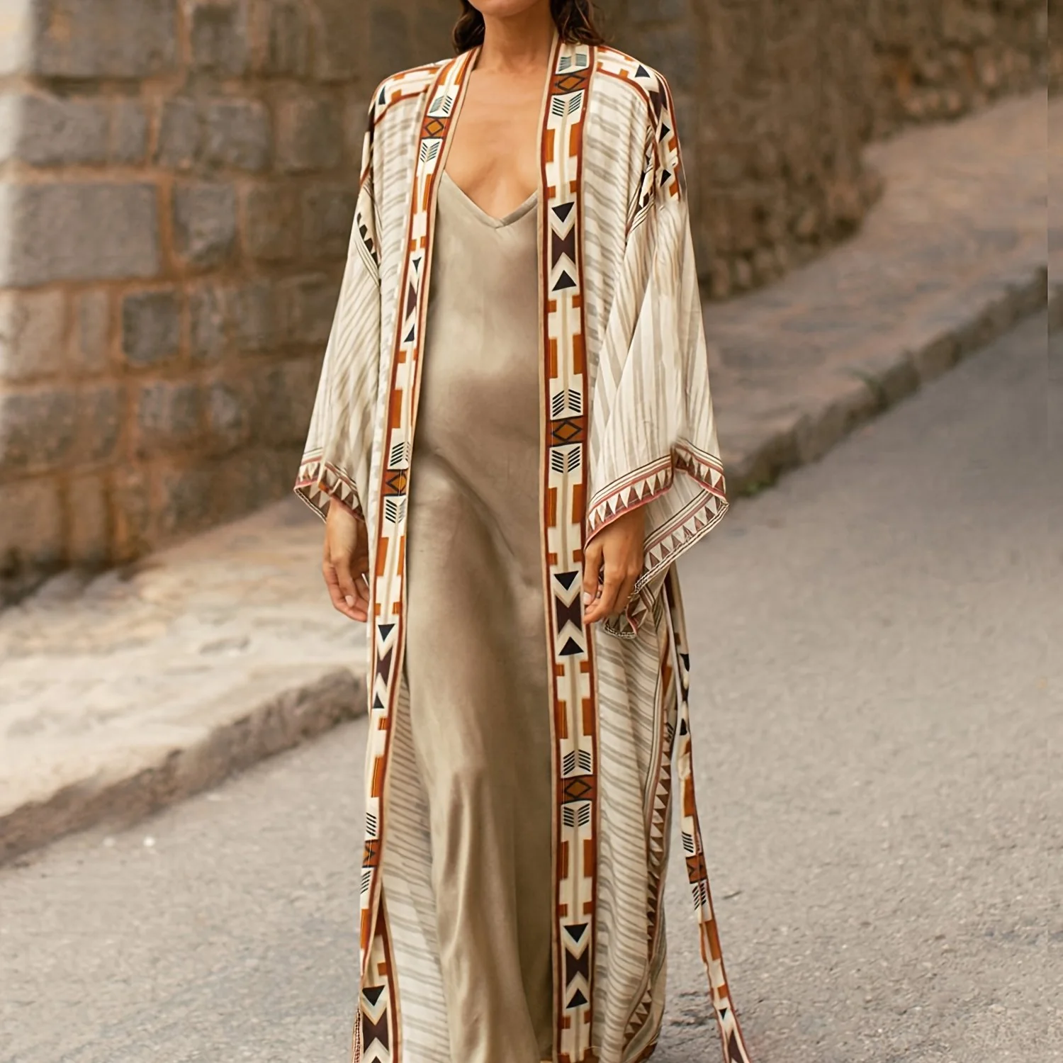 Geo Print Open Front Belted Kimono, Boho Long Sleeve Beachwear Cove Up, Women's Clothing