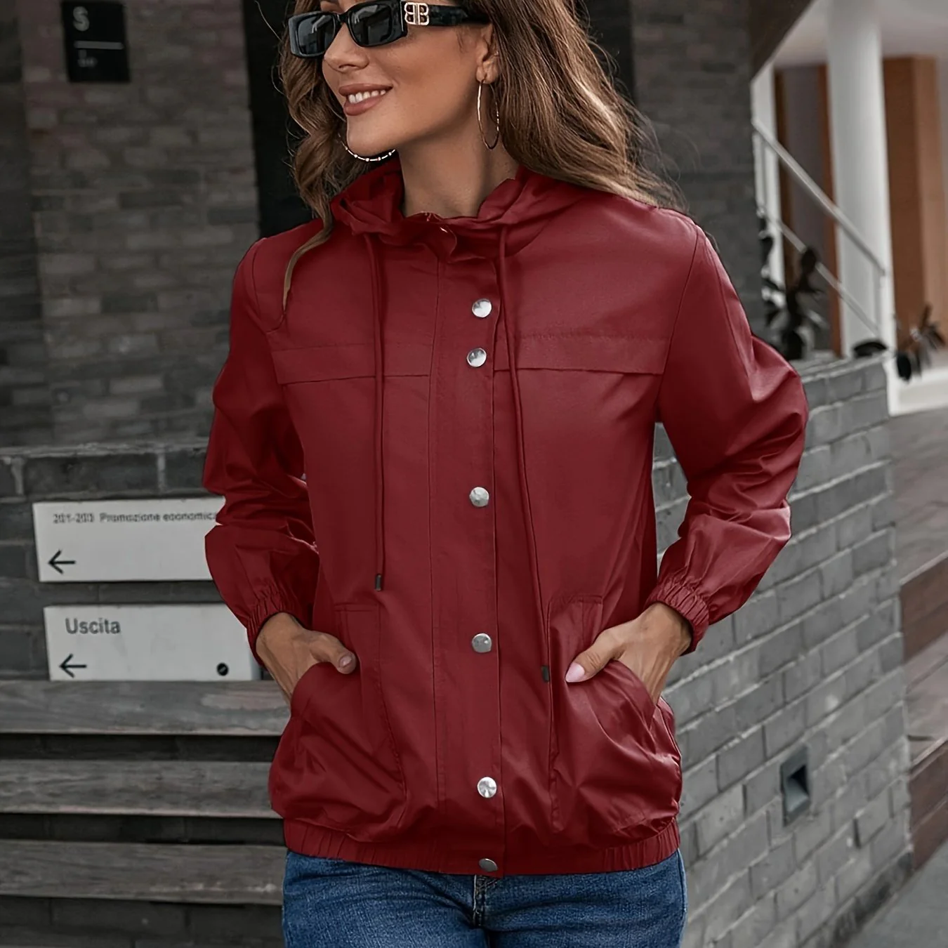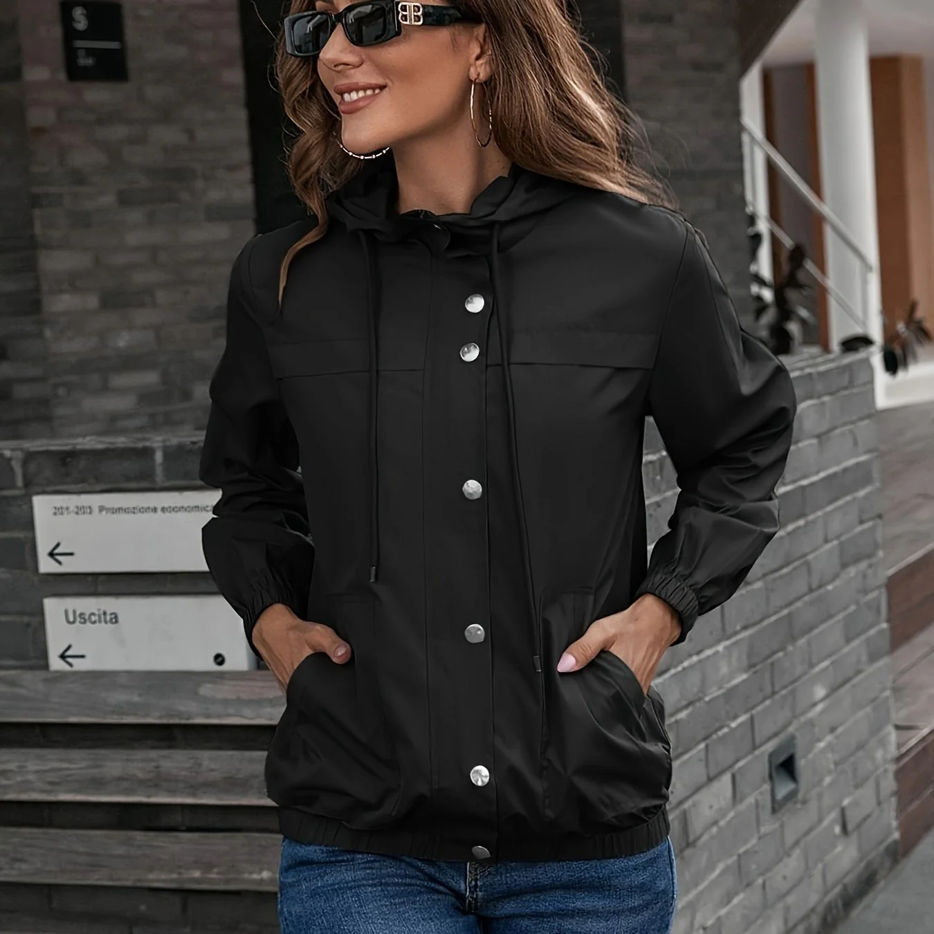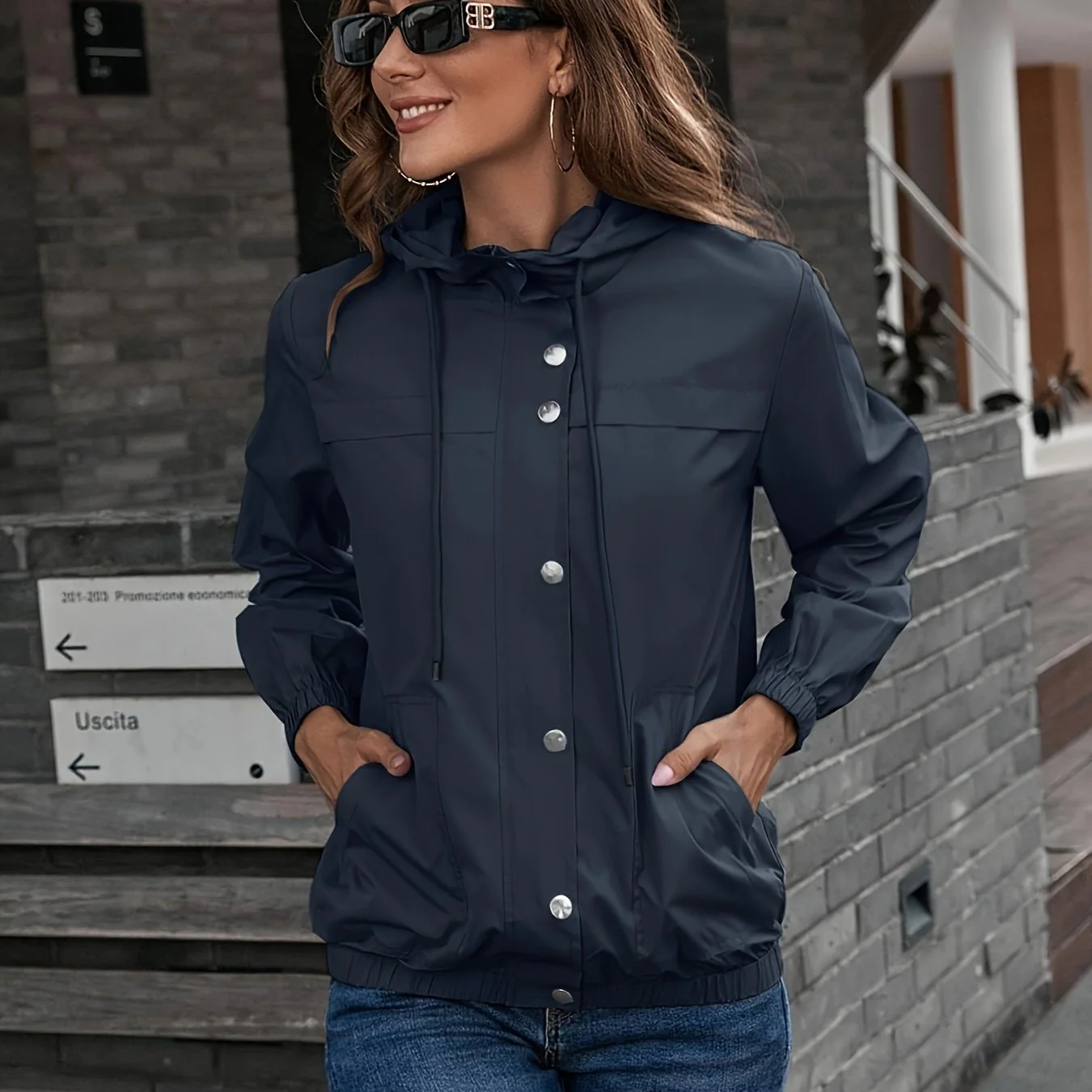 Drawstring Hooded Windproof Jacket, Casual Solid Long Sleeve Outerwear, Women's Clothing
