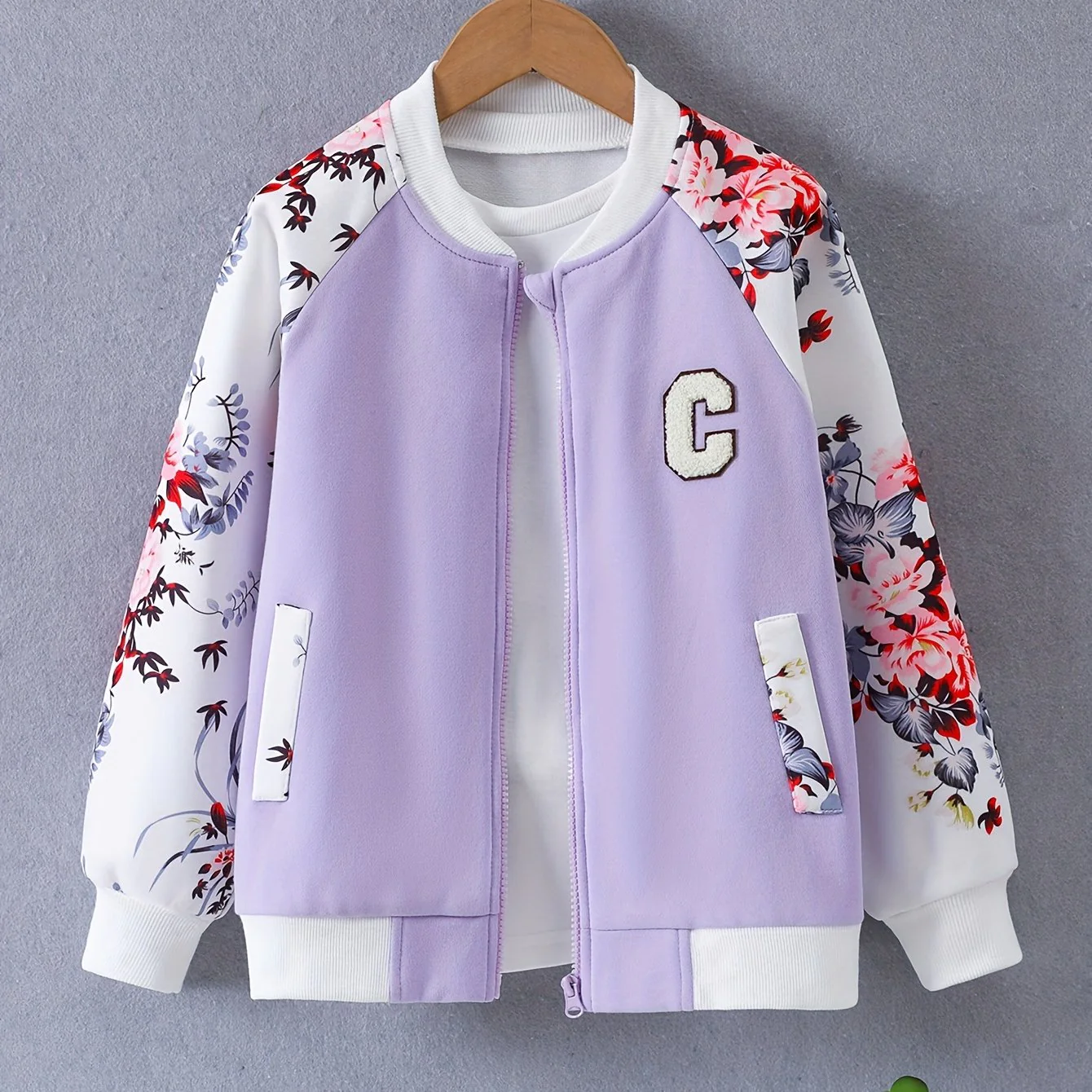 Girls Zip Jacket Floral Print Long Sleeve Fleece Warm Jacket Coat For Kids Teens Autumn And Winter