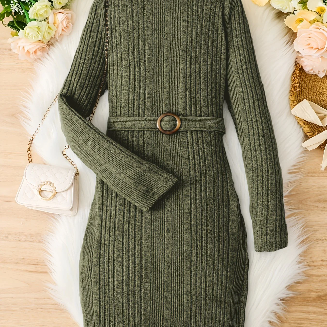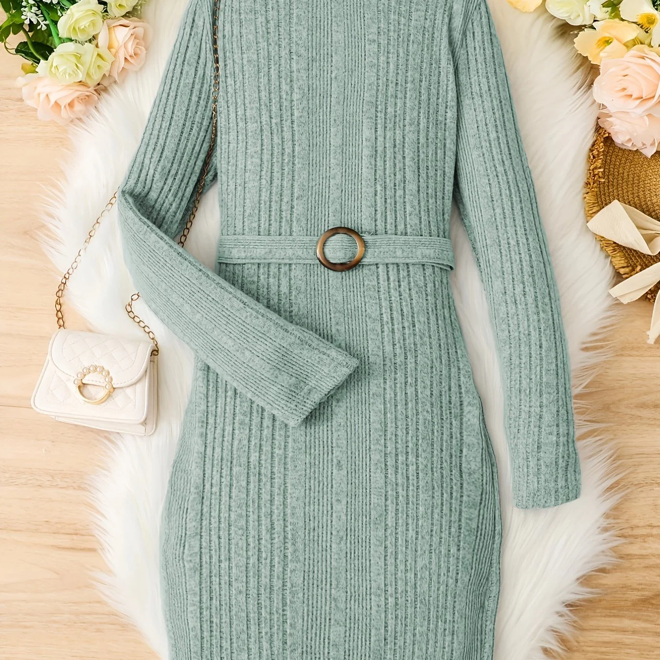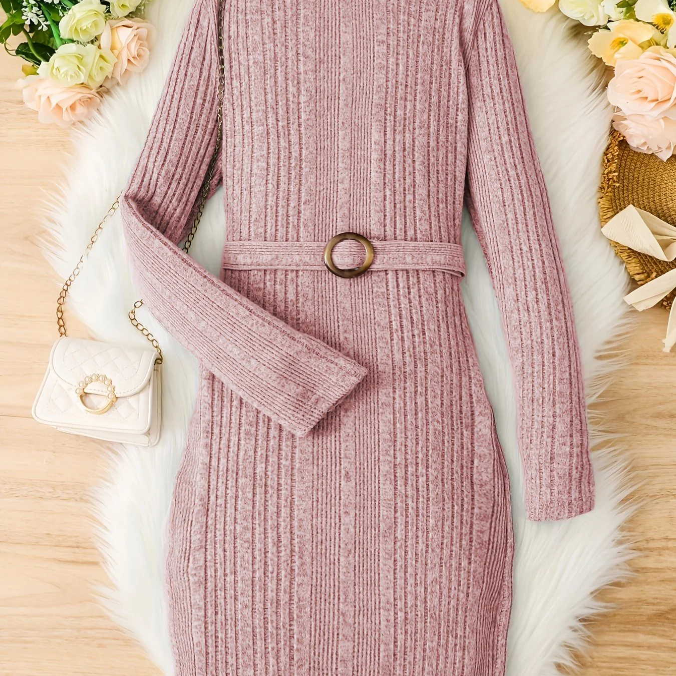 Teen Girls Rib Knitted Warm Bodycon Sweater Dress With Belt