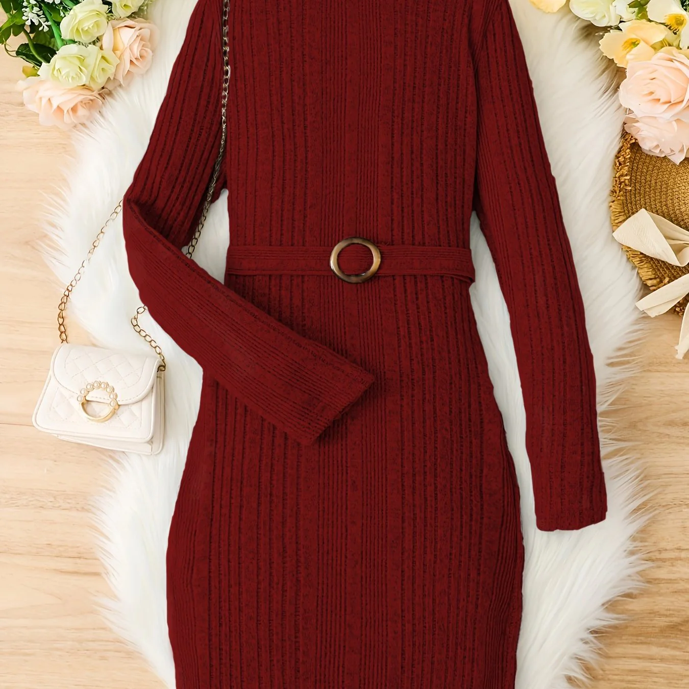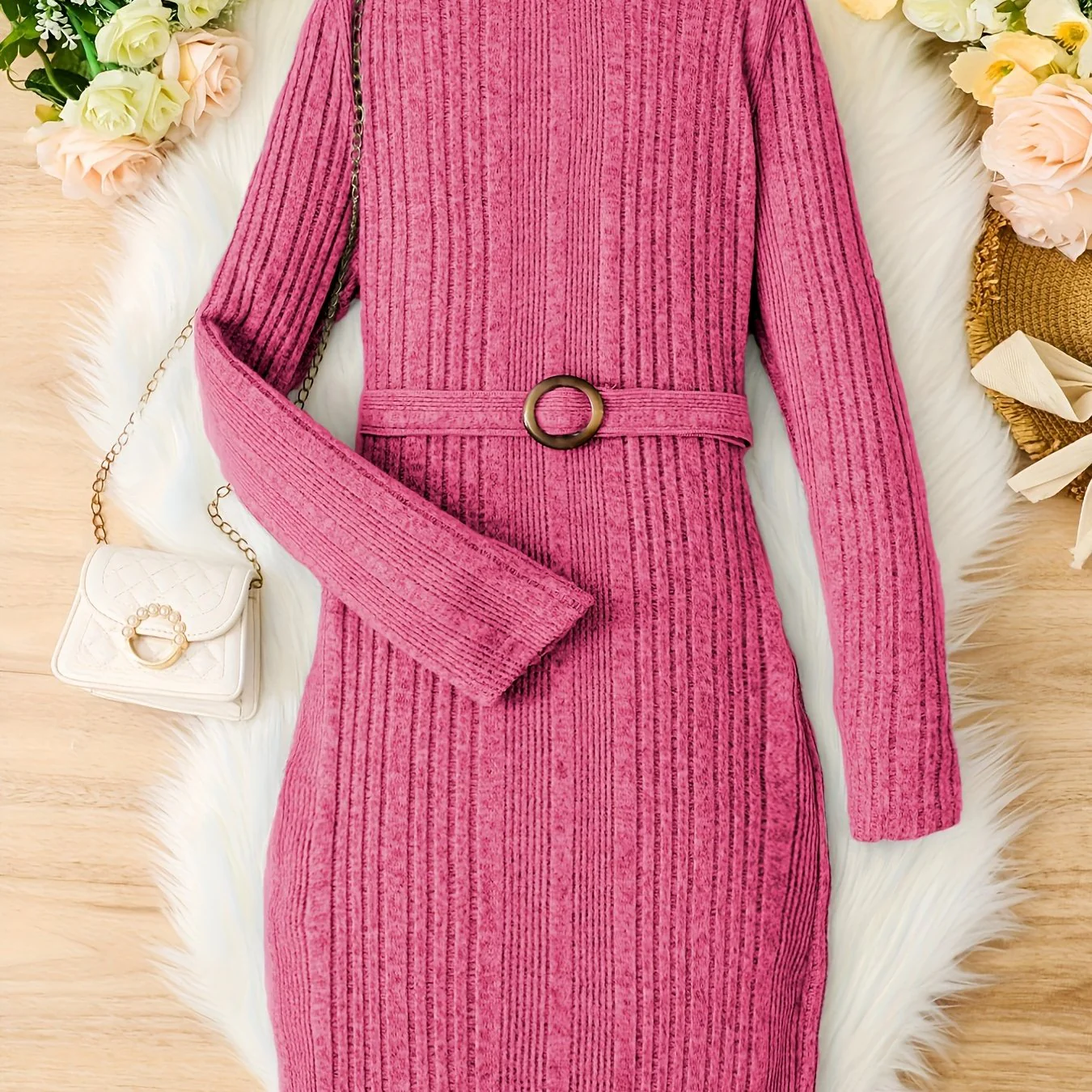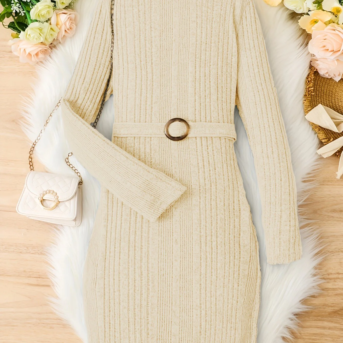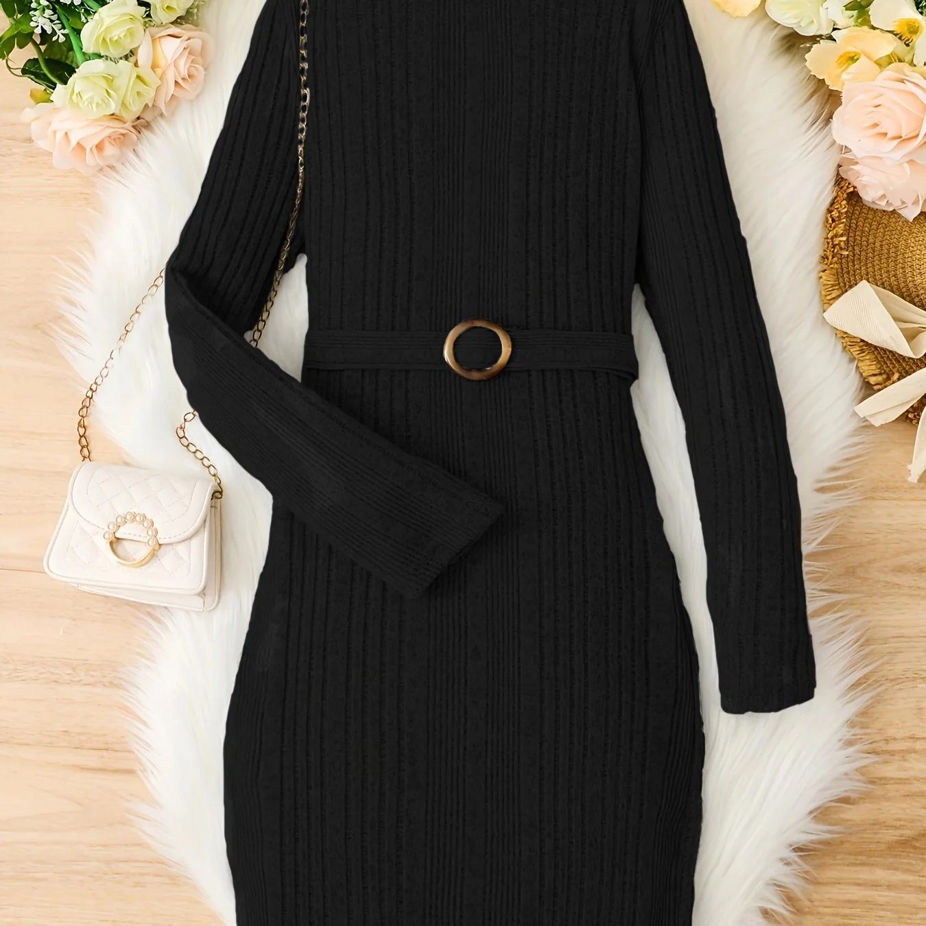 Teen Girls Rib Knitted Warm Bodycon Sweater Dress With Belt