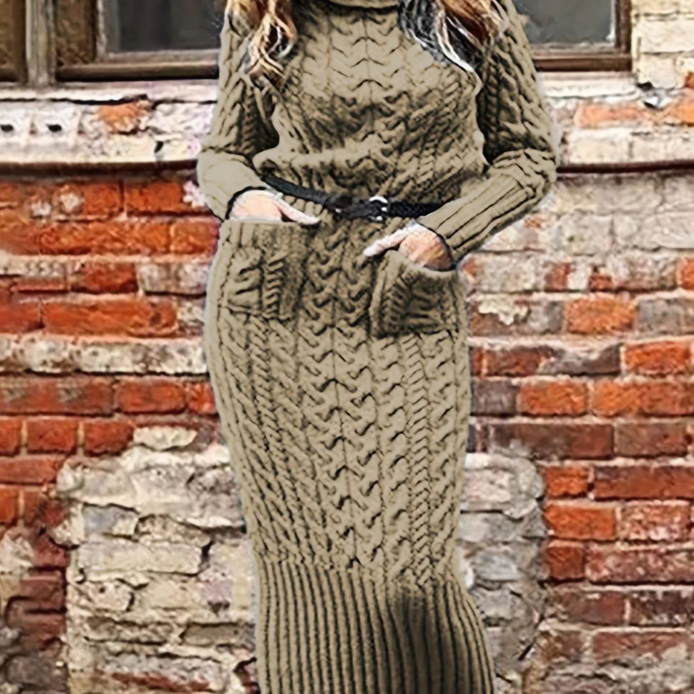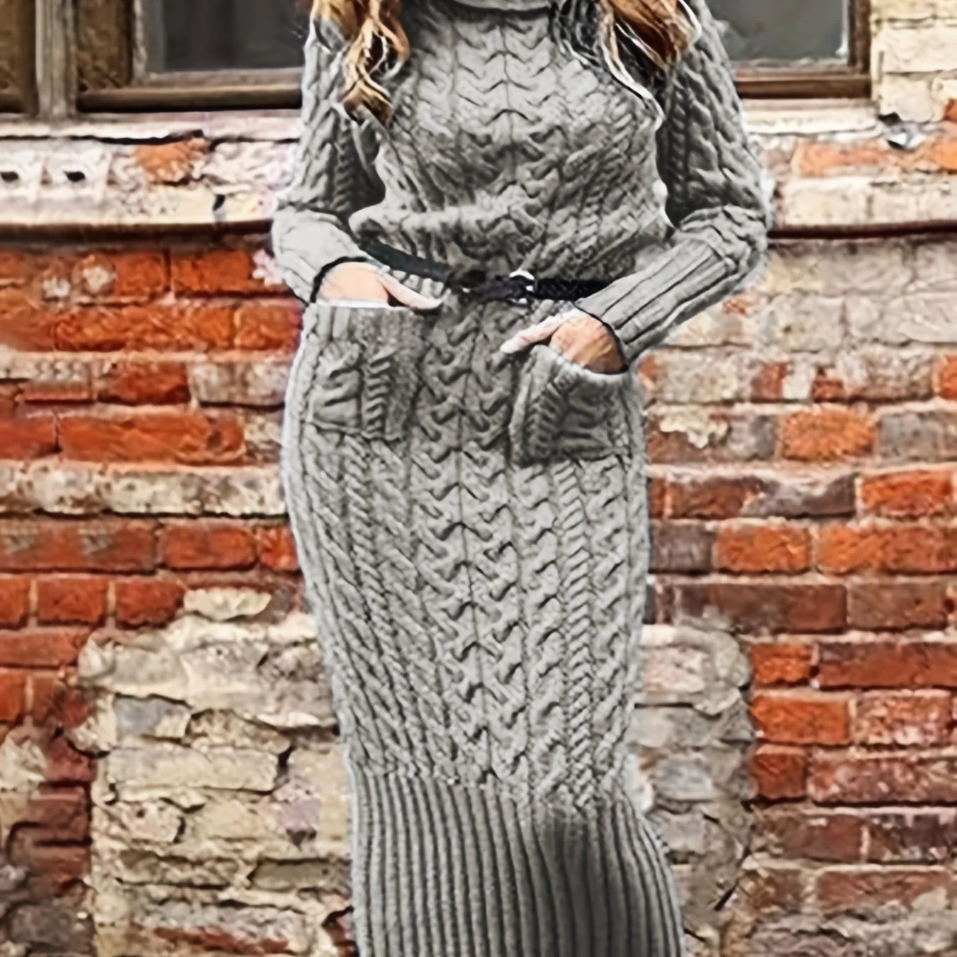 Solid Cable Knit Sweater Dress, Casual Turtleneck Long Sleeve Pocket Front Dress, Women's Clothing