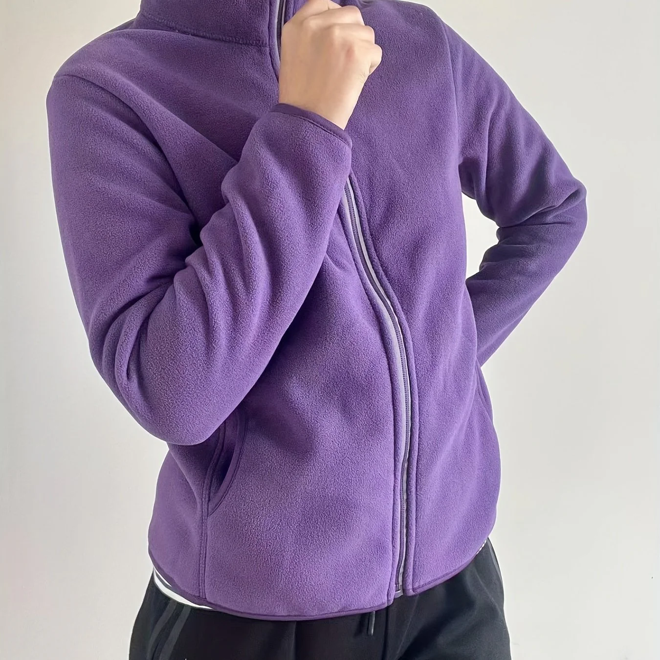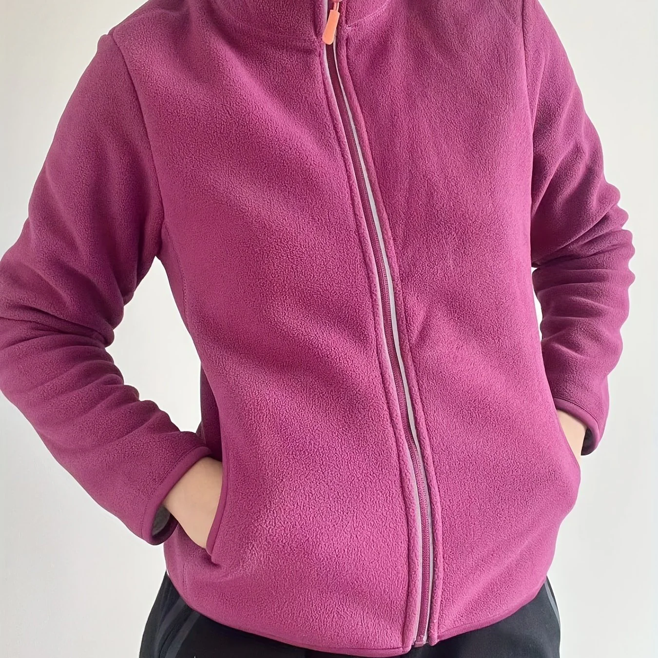 Plain Fleece Liner Outdoor Jacket, Full Zipper Long Sleeves Mock Neck For Hiking Sports Coat, Women's Activewear