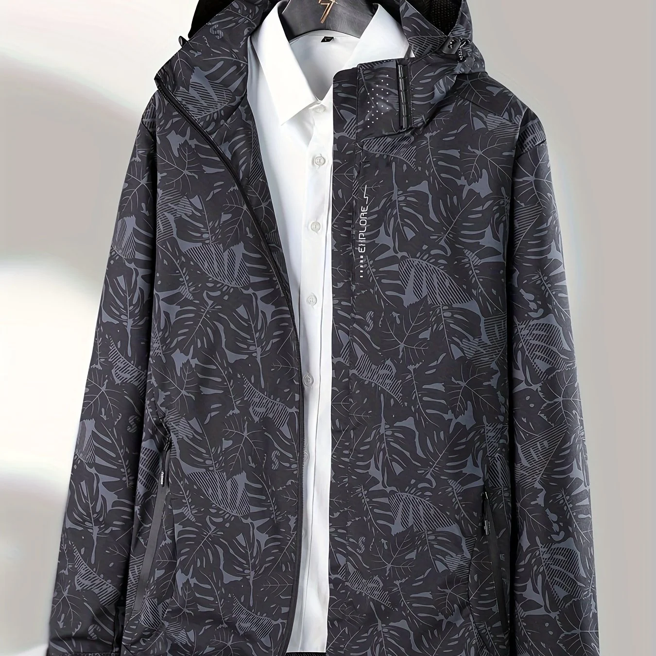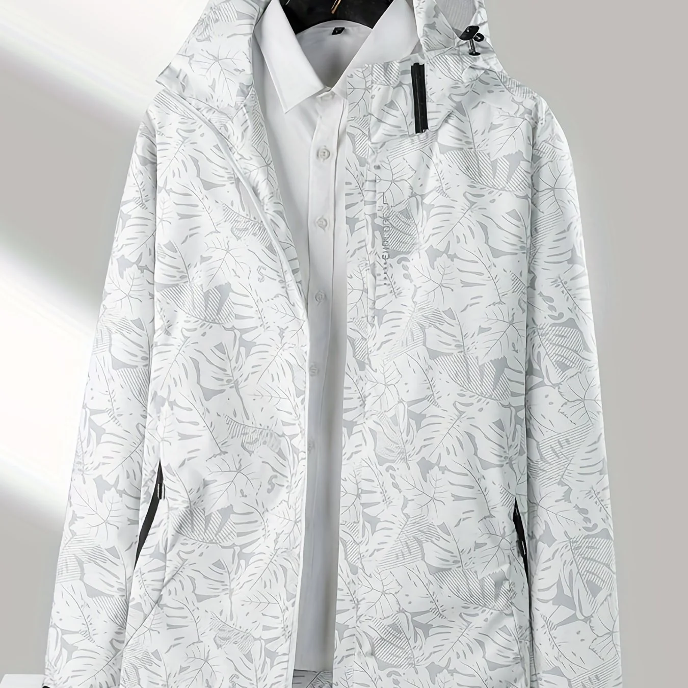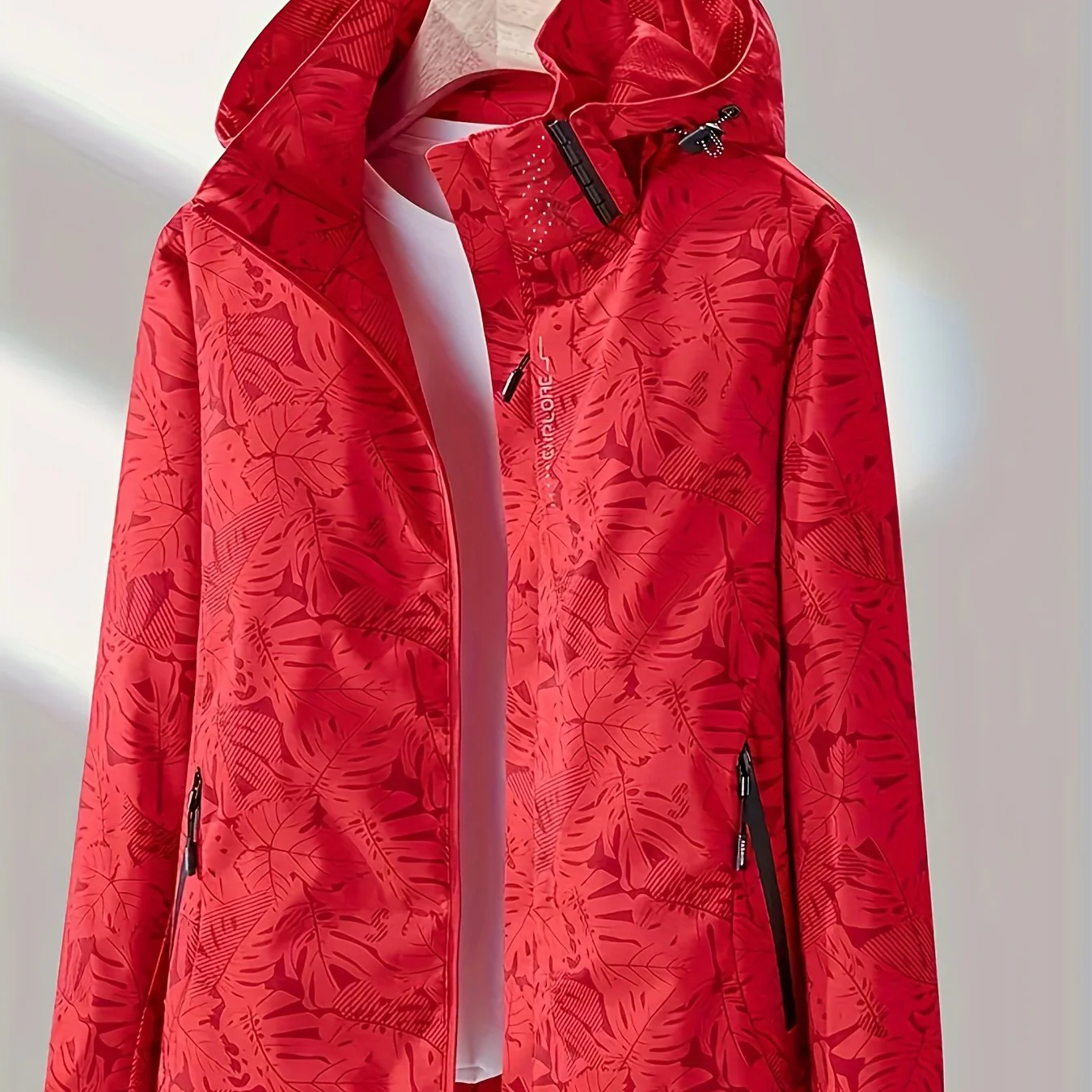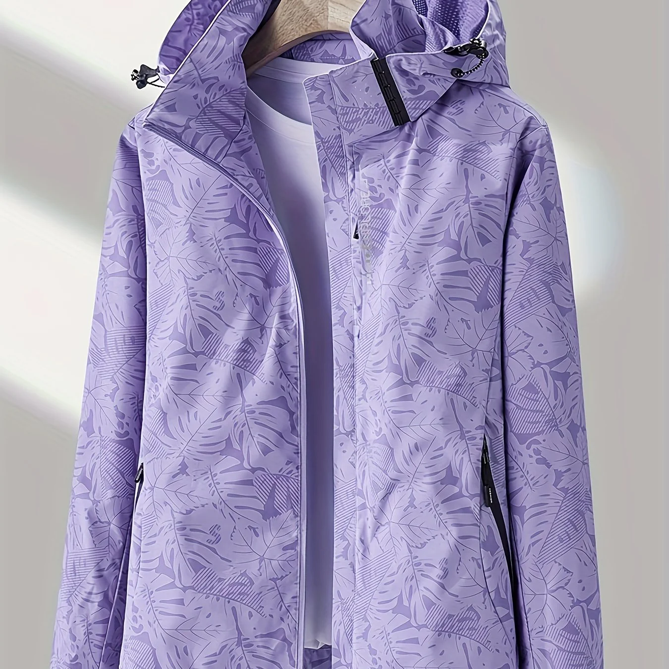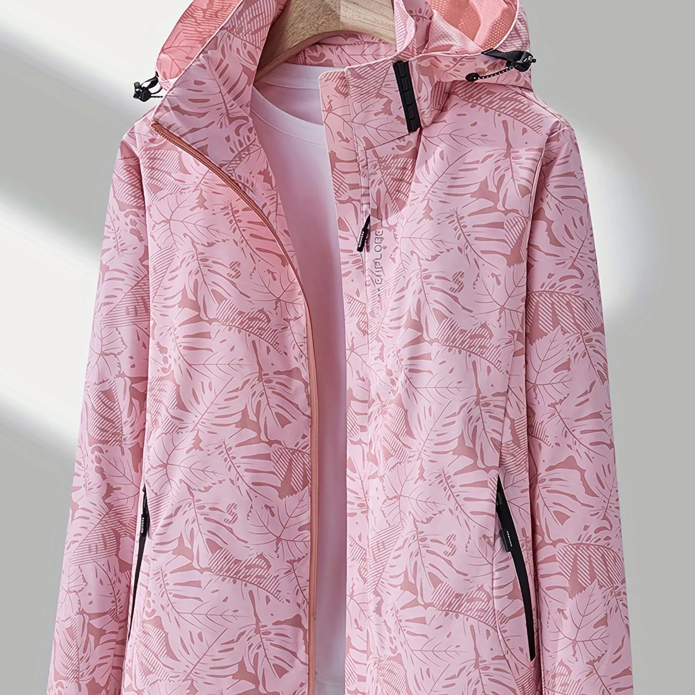 Leaf Print Outdoor Jacket With Removable Hood, Women's Windproof & Rainproof Jacket, Women's Outdoor Clothing