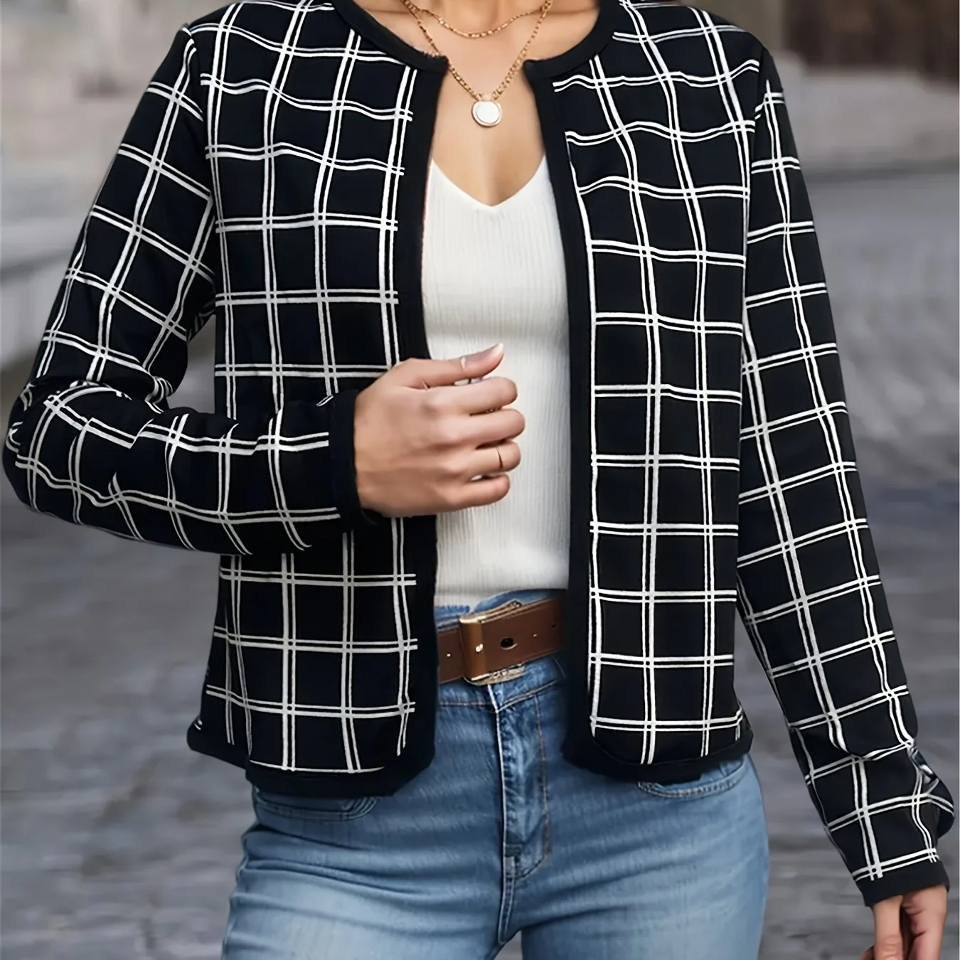 Plaid Open Front Jacket, Casual Contrast Trim Jacket For Spring & Fall, Women's Clothing