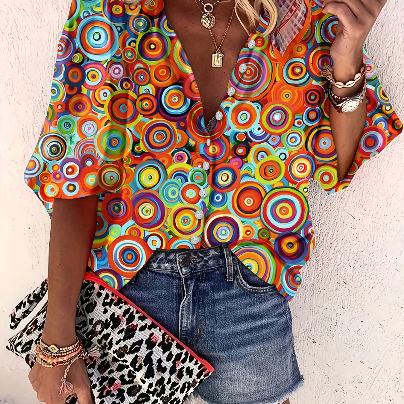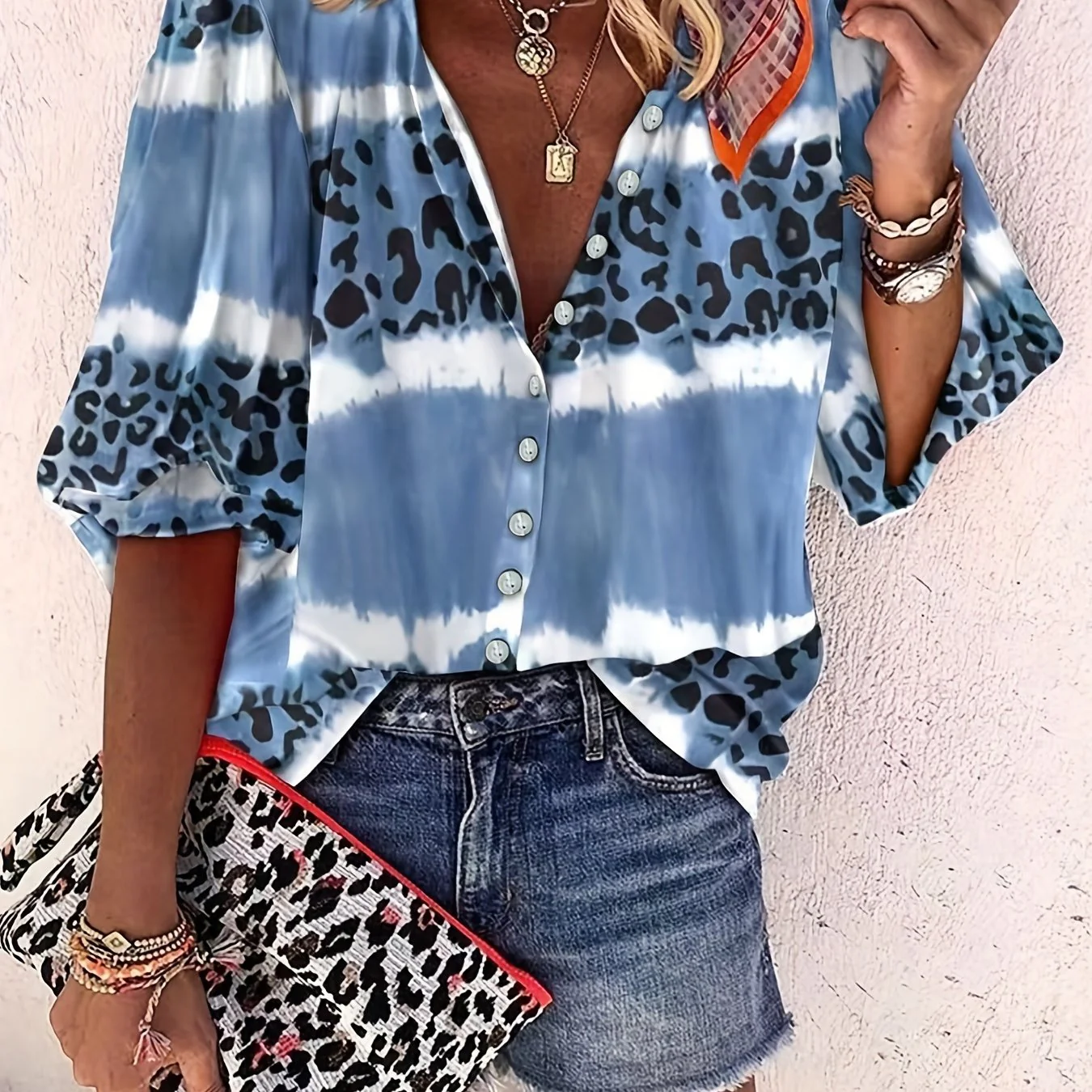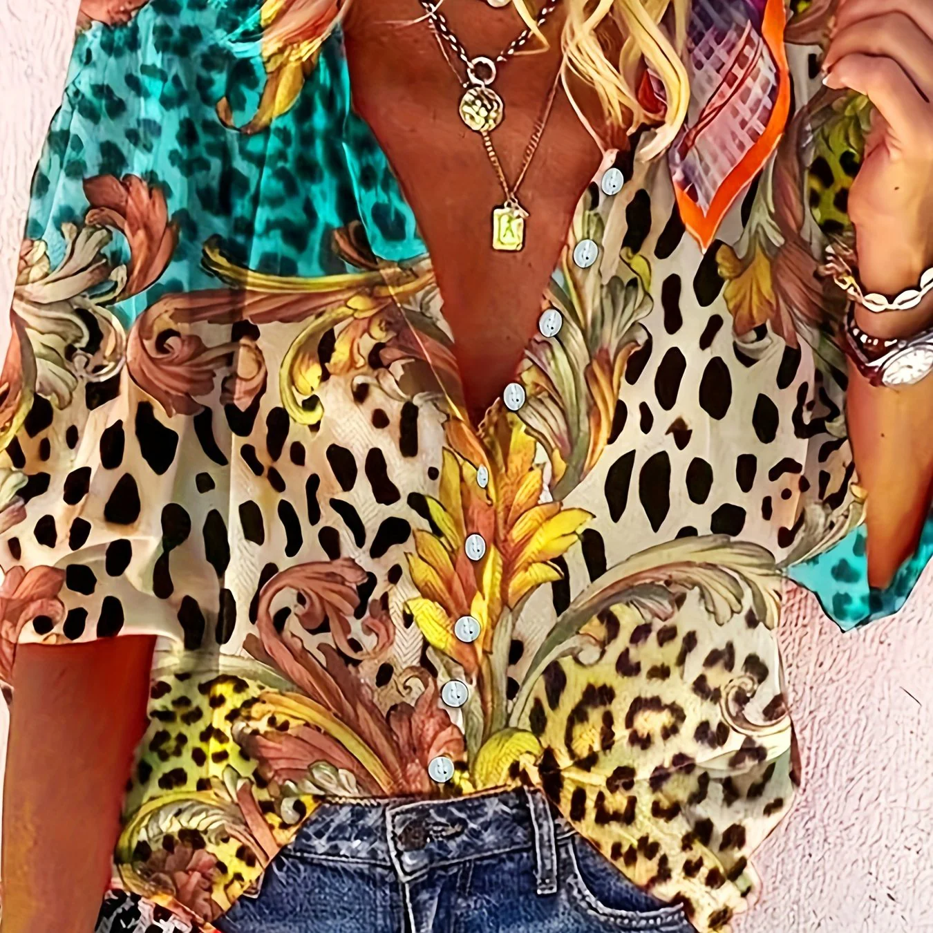 Floral Print Button Front Blouse, Casual Long Sleeve Crew Neck Blouse For Spring & Fall, Women's Clothing