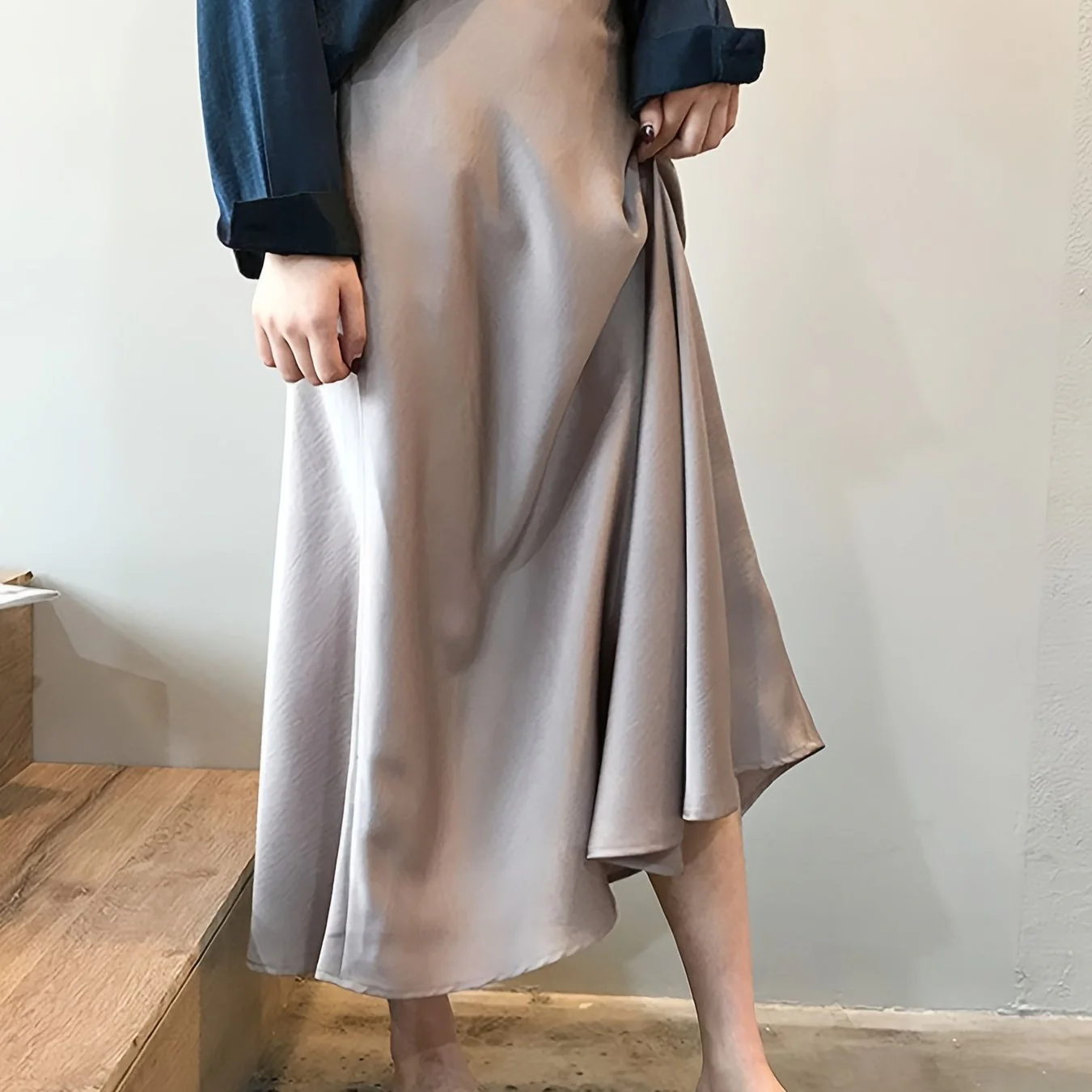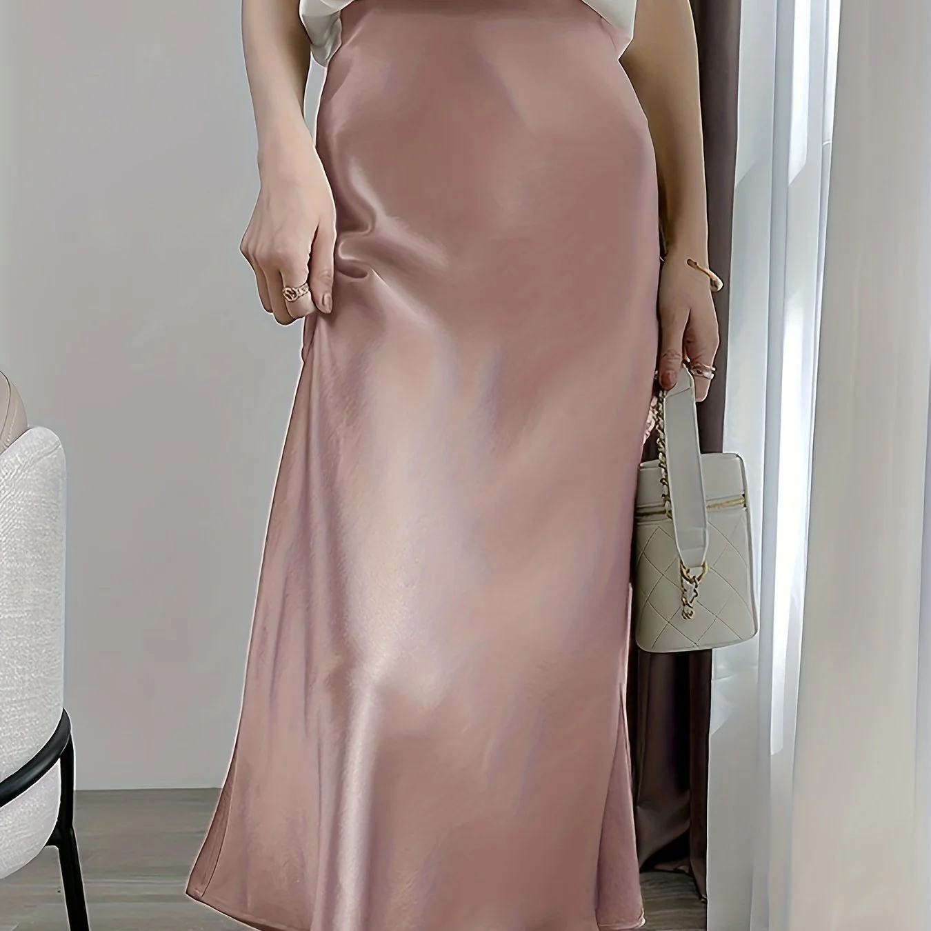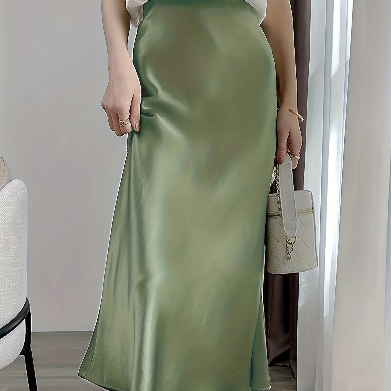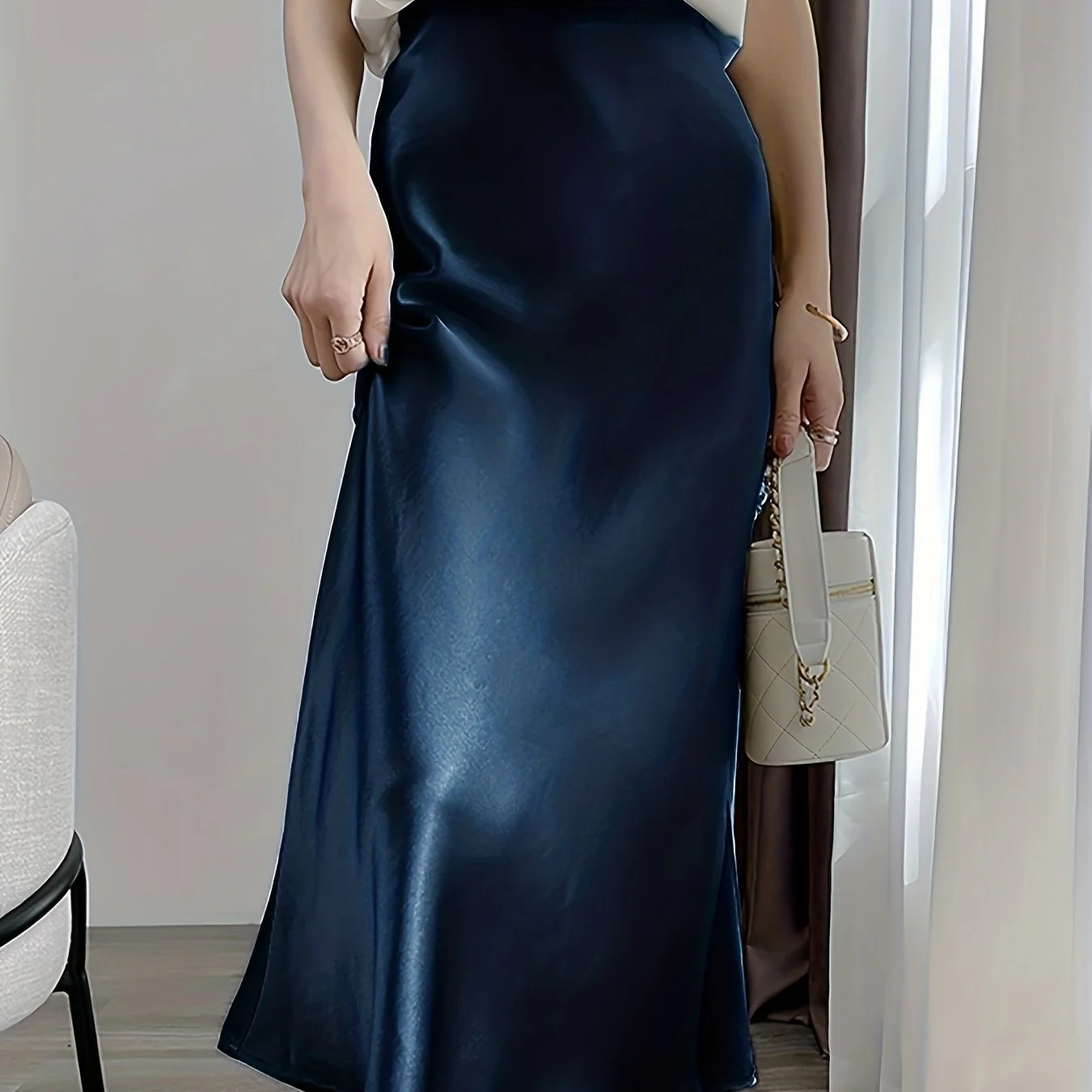Retro Satin Maxi Skirts, Casual Solid High Waist Vintage Fashion Summer Skirts, Women's Clothing