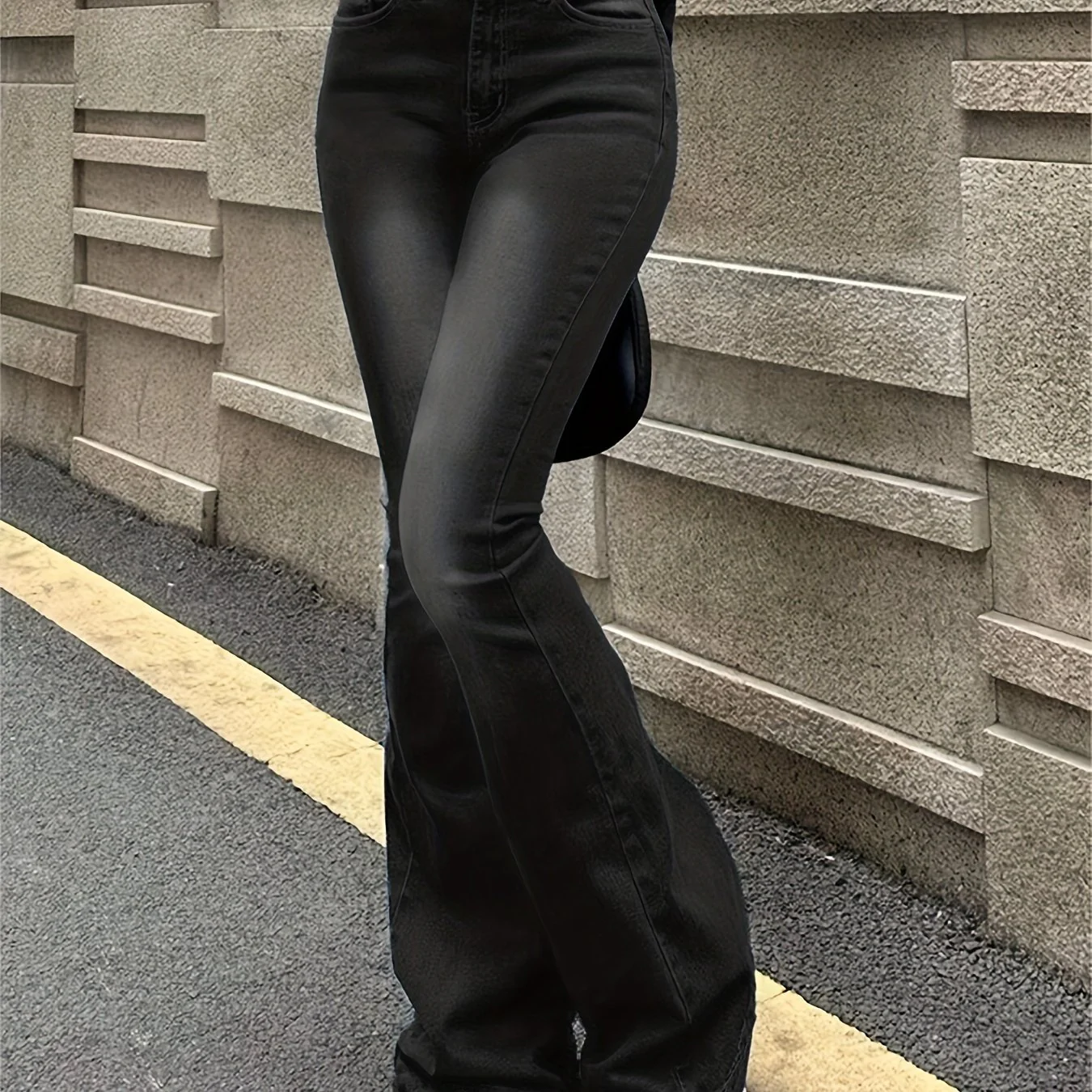 Plain Washed Retro Flare Jeans, Slim Fit High Stretch Slant Pockets Bell Bottom Jeans, Women's Denim Jeans & Clothing