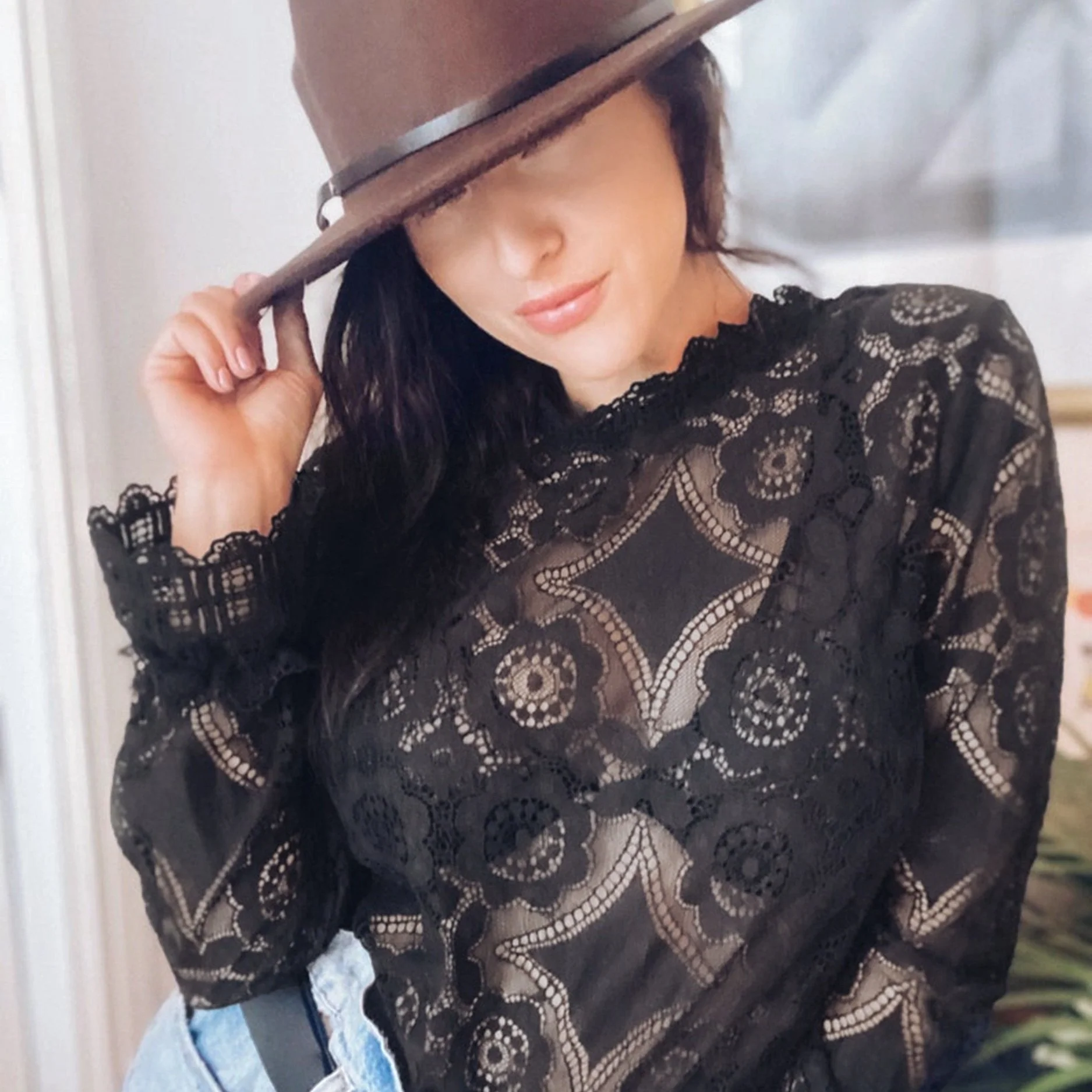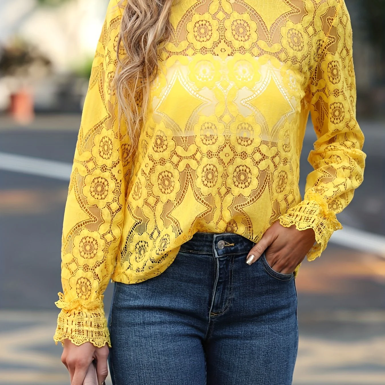 Solid Lace Blouse, Elegant Vintage Semi-Sheer High Neck Long Sleeve Blouse, Women's Clothing