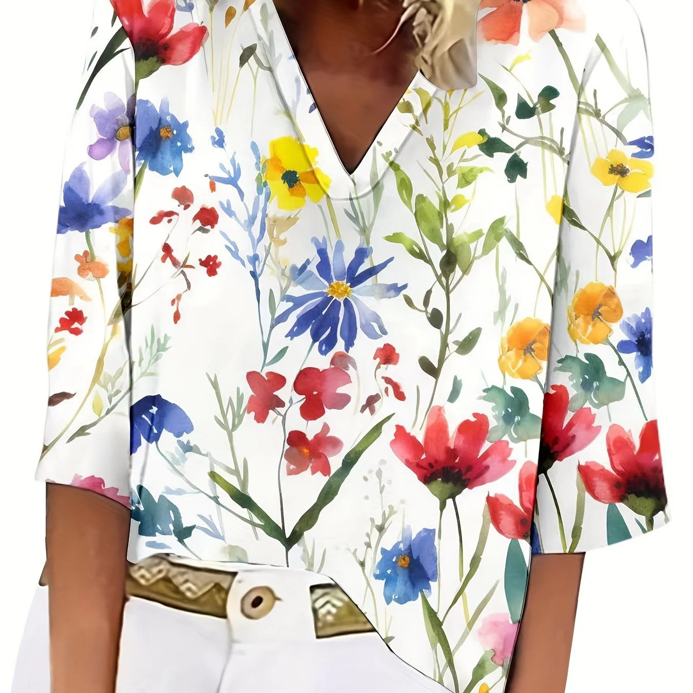 Plant Print Blouse, Casual V Neck Summer 3/4 Sleeve Blouse, Women's Clothing